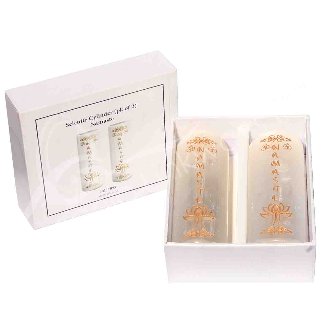 MEDITATION CHARGER CYLINDER – SELENITE ENGRAVED NAMASTE GOLD (PK 2) 1.5″DIA. X 4″H