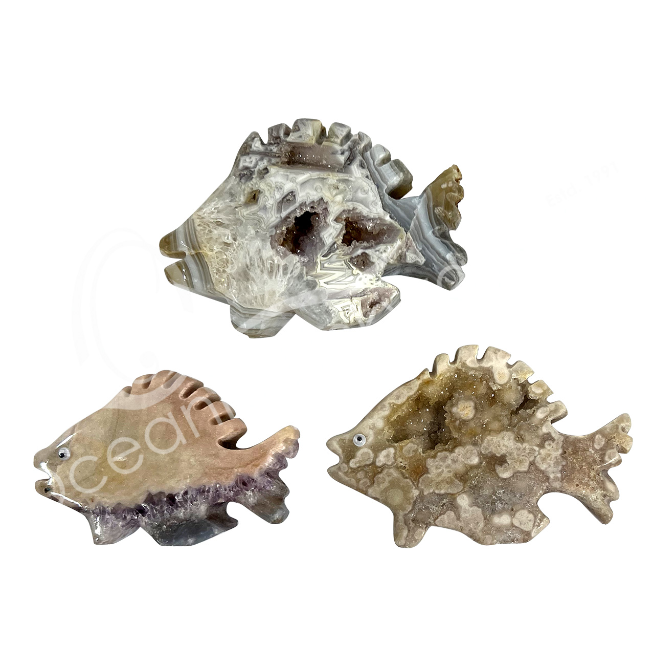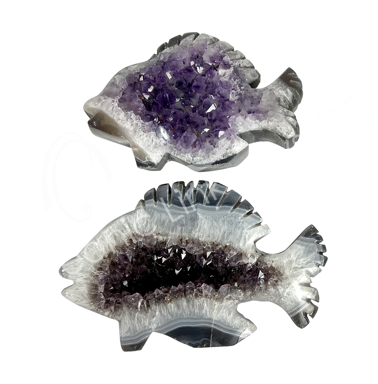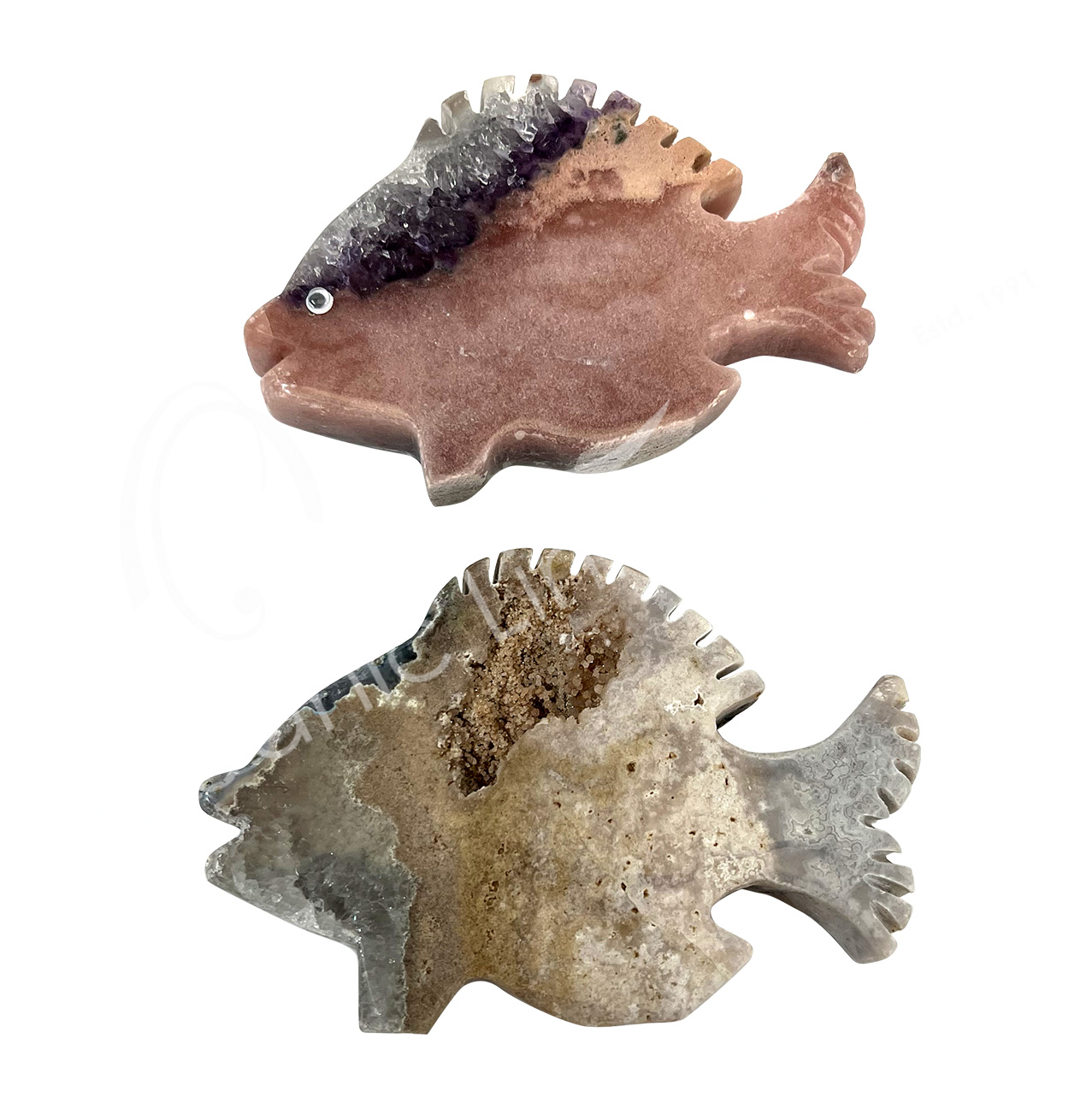 CARVING – FISH AMETHYST & PINK AMETHYST WITH DRUSE 3-8″