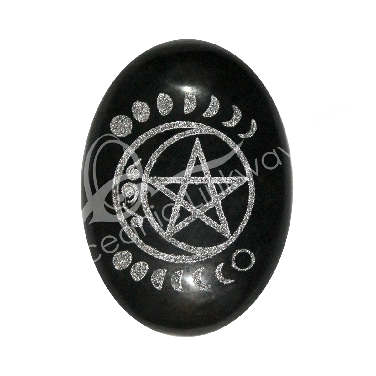(CLOSE OUT) PALM STONE – TOURMALINE, BLACK PENTACLE & MOON PHASES SILVER 3″