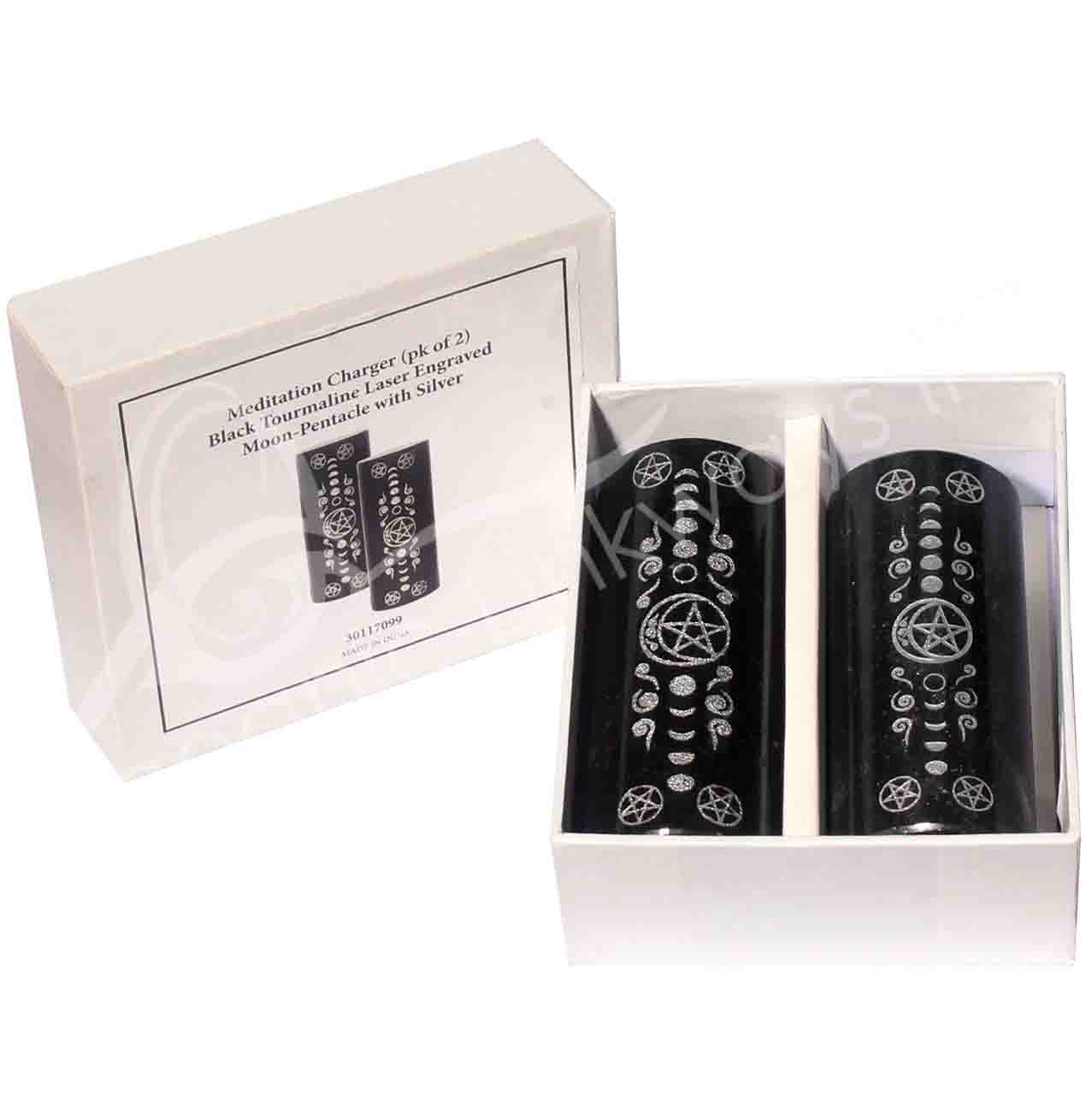 (CLOSE OUT) MEDITATION CHARGER CYLINDER – TOURMALINE, BLACK PENTACLE/MOON PHASES SILVER (PK 2) 1.5”DIA. X 4”H