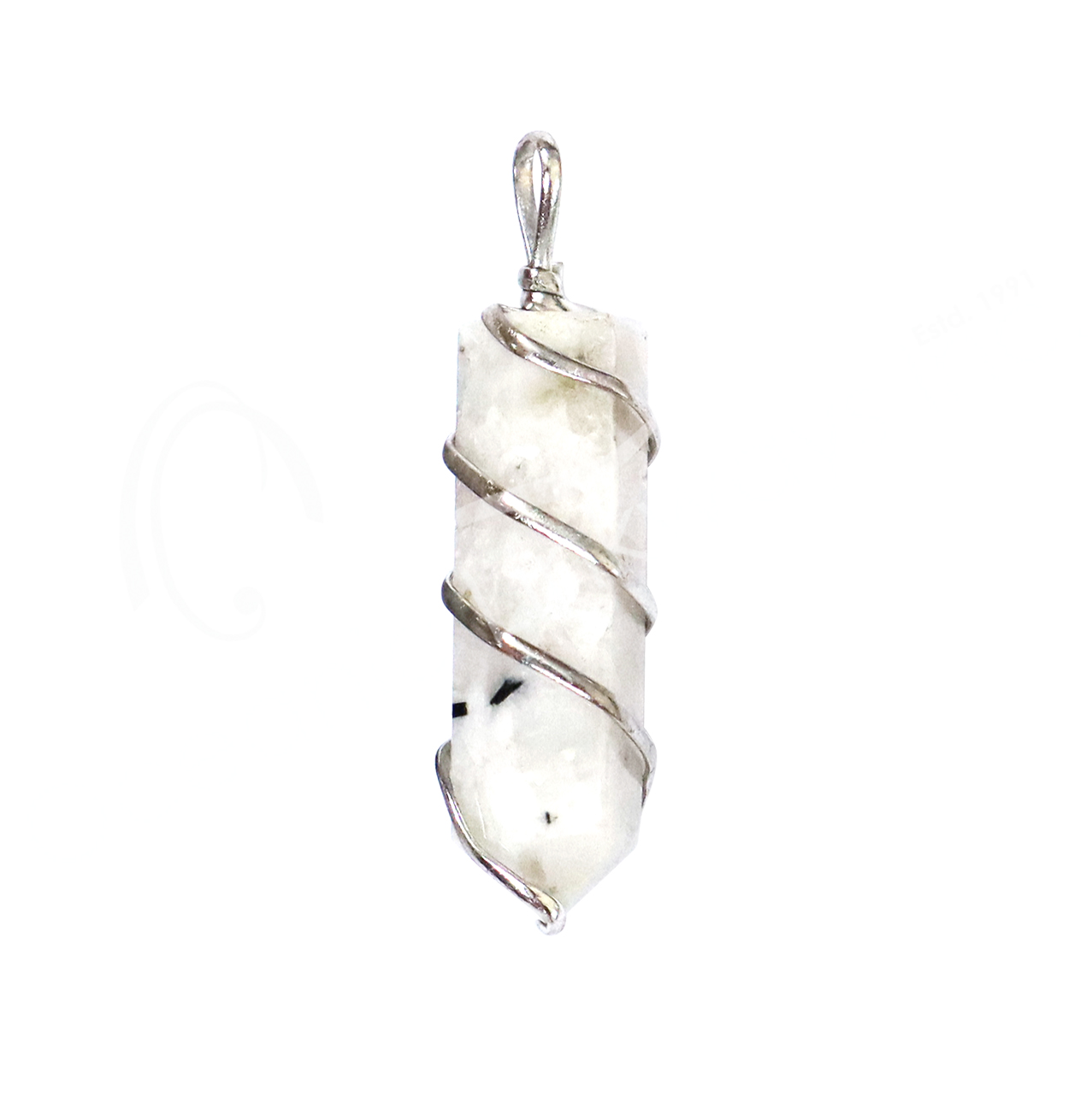 PENDANT – POINT WITH TWISTED WIRE RAINBOW MOONSTONE 1.5″