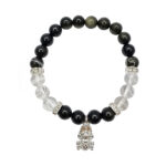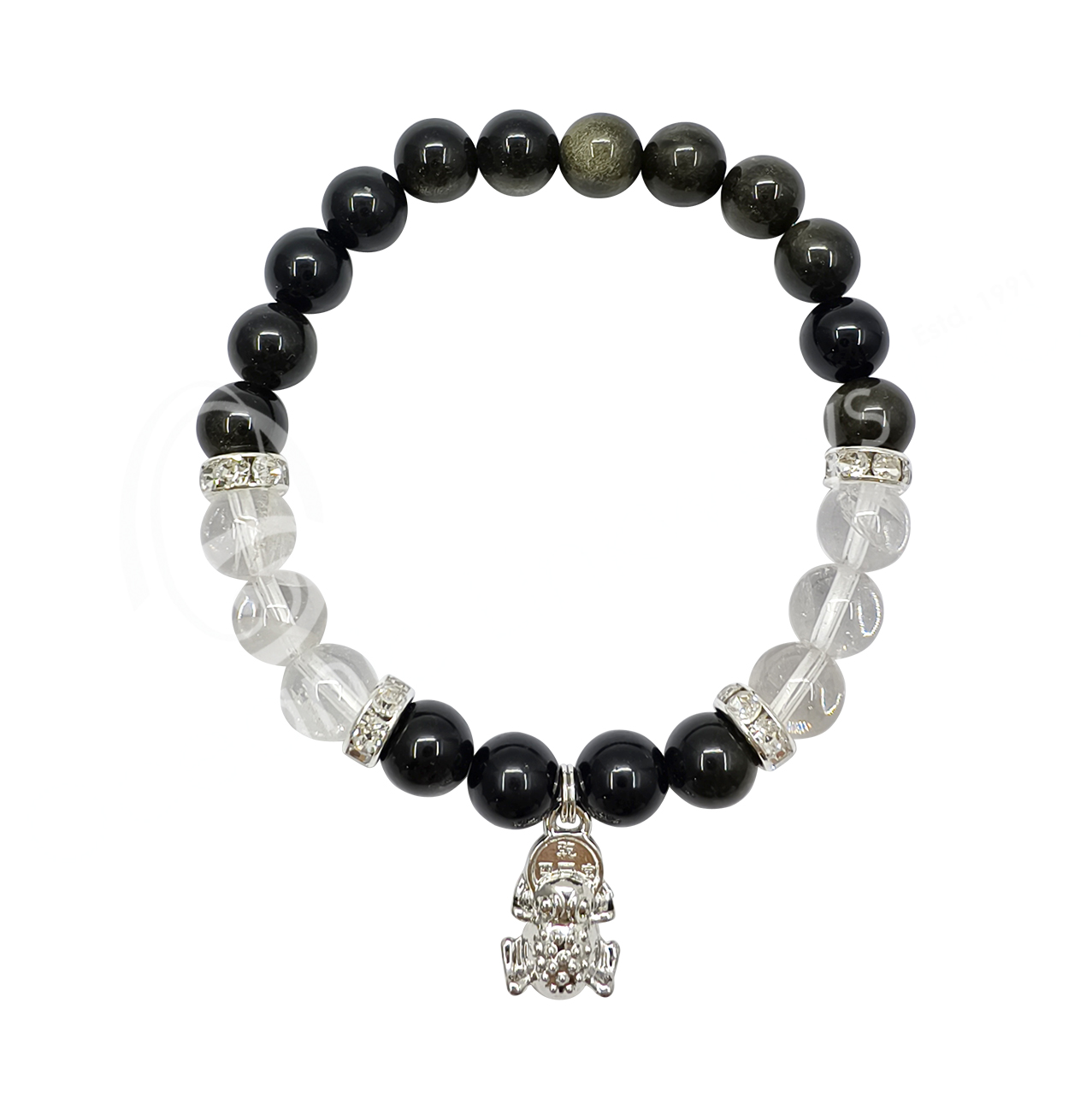 BRACELET – OBSIDIAN, GOLDEN SHEEN & CRYSTAL QUARTZ FROG (8-8.5 MM) 7.15-7.25″