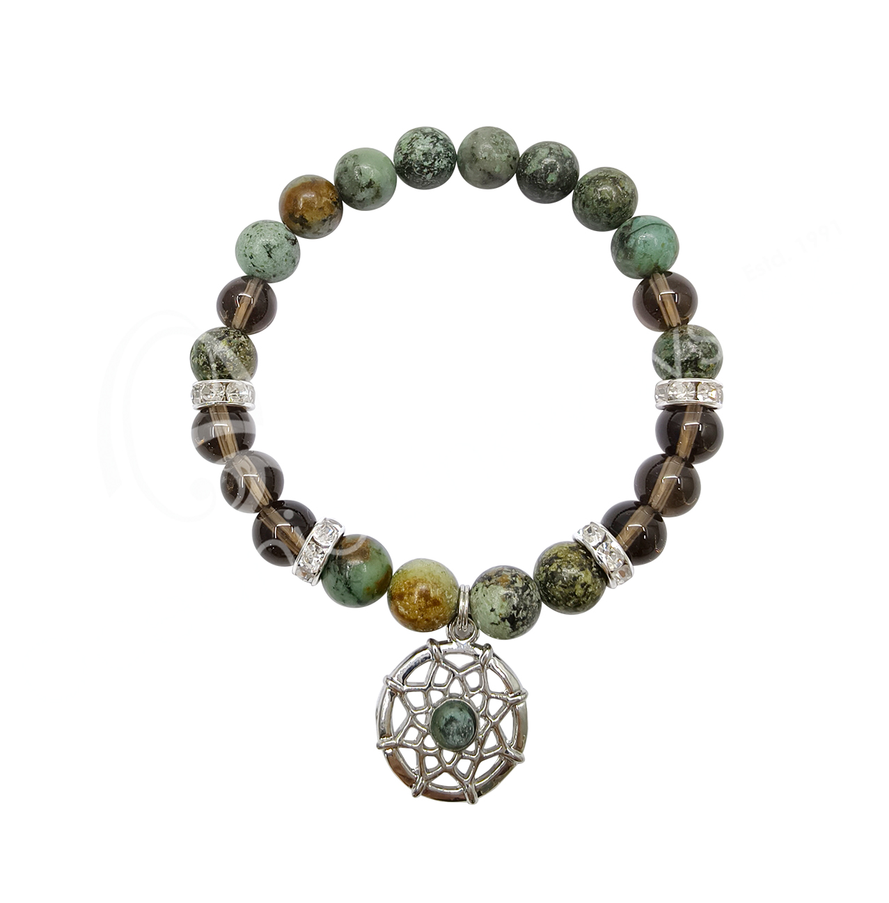 BRACELET – SMOKY QUARTZ & AFRICAN TURQUOISE DREAMCATCHER (8-8.5 MM) 7.15-7.25″