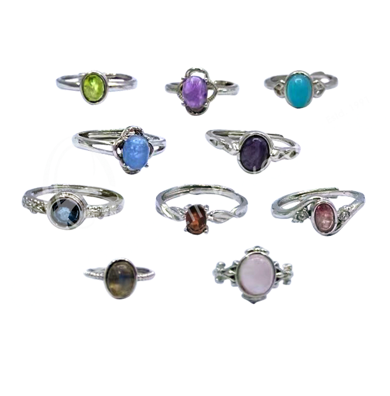 RING – BRASS, SILVER PLATED MIXED STONES & SETTINGS ADJUSTABLE (TRAY OF 100)