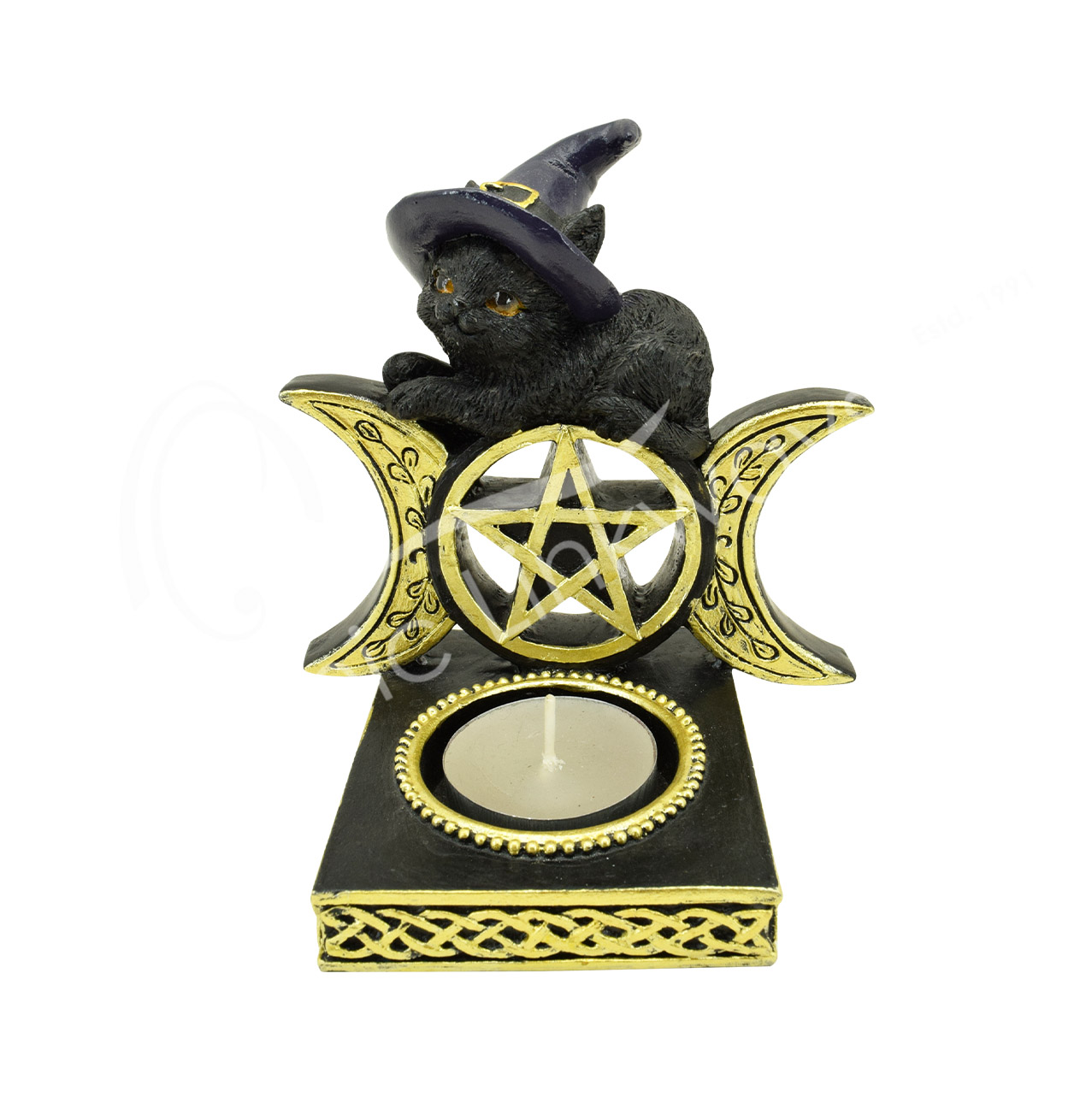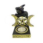 CANDLE HOLDER – BLACK CAT TRIPLE MOON PENTACLE 4.15″L X 5″H