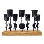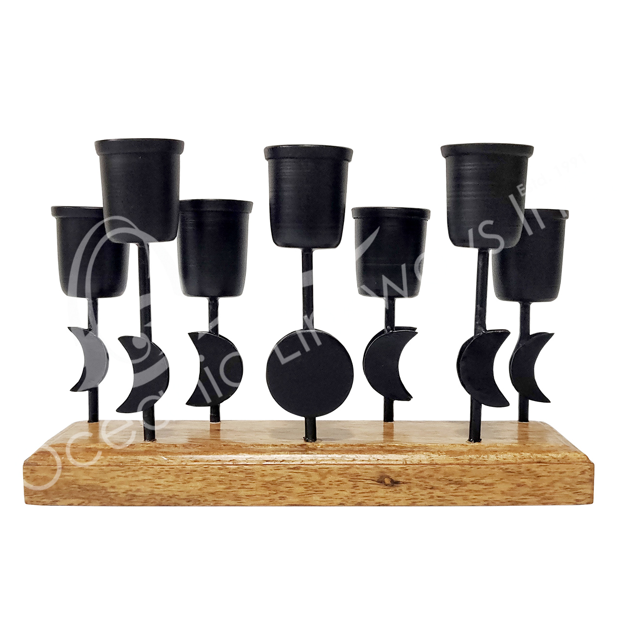 MINI CANDLE HOLDER – IRON MOON PHASES ON WOOD BASE 7.5″W