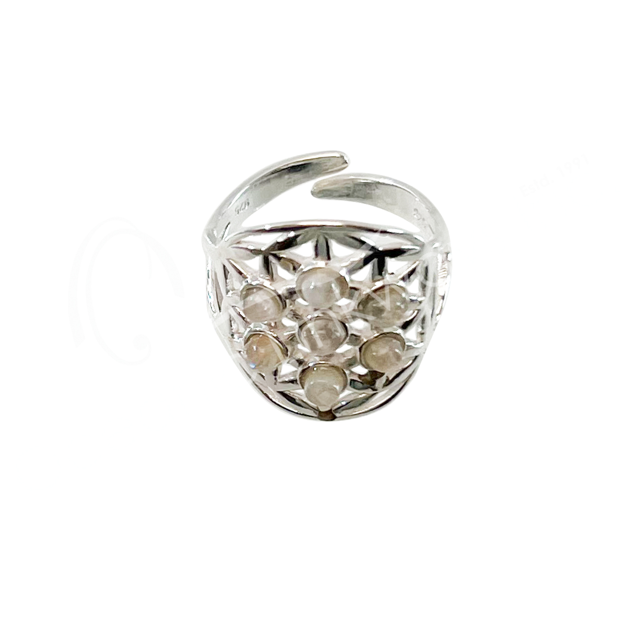 STERLING SILVER – RING, ADJUSTABLE FLOWER OF LIFE RAINBOW MOONSTONE 0.75″