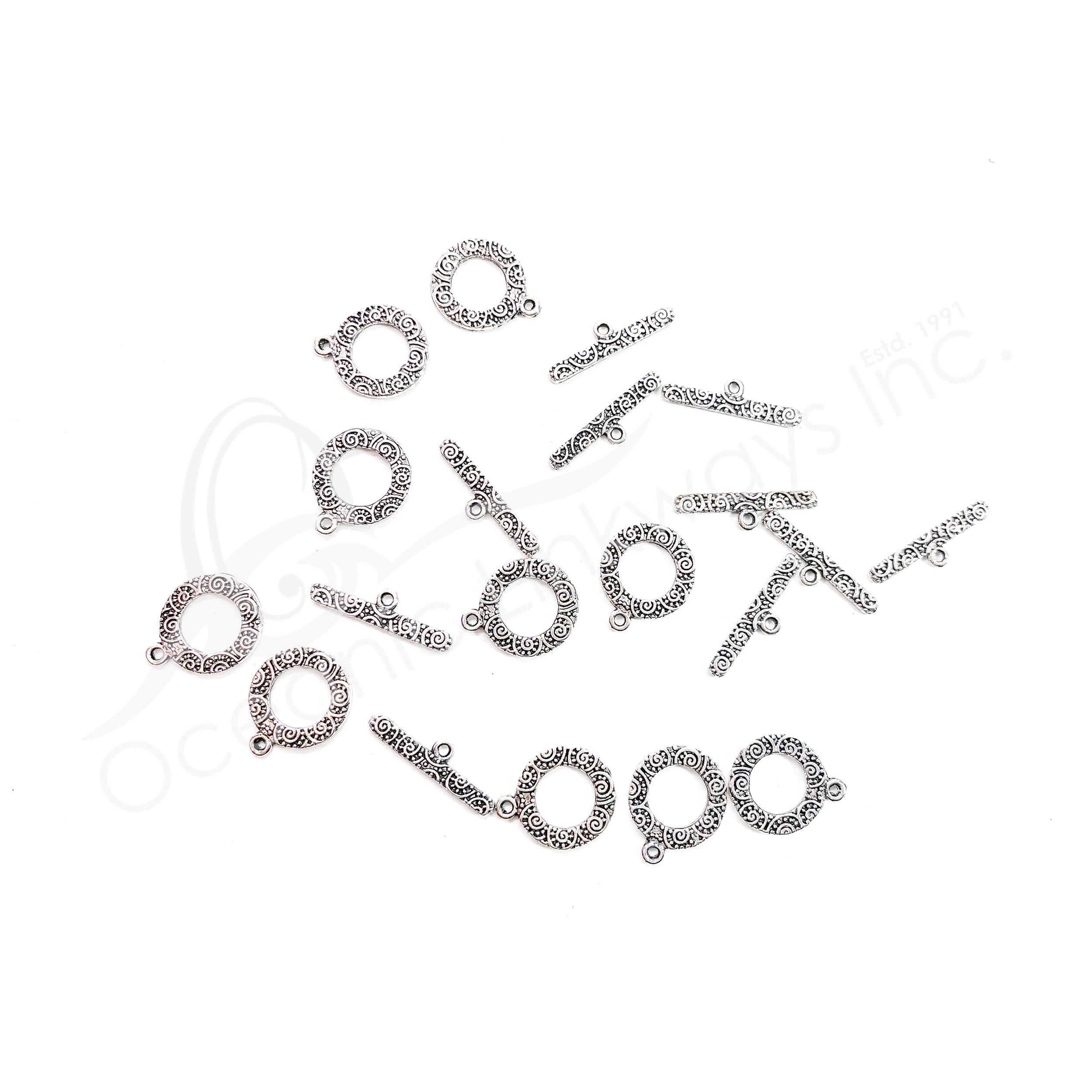 (CLOSE OUT) BEADS – METAL TOGGLE CLASP WITH SPIRALS (PK 10 PAIRS) 1.5 CM D X 2 MM T