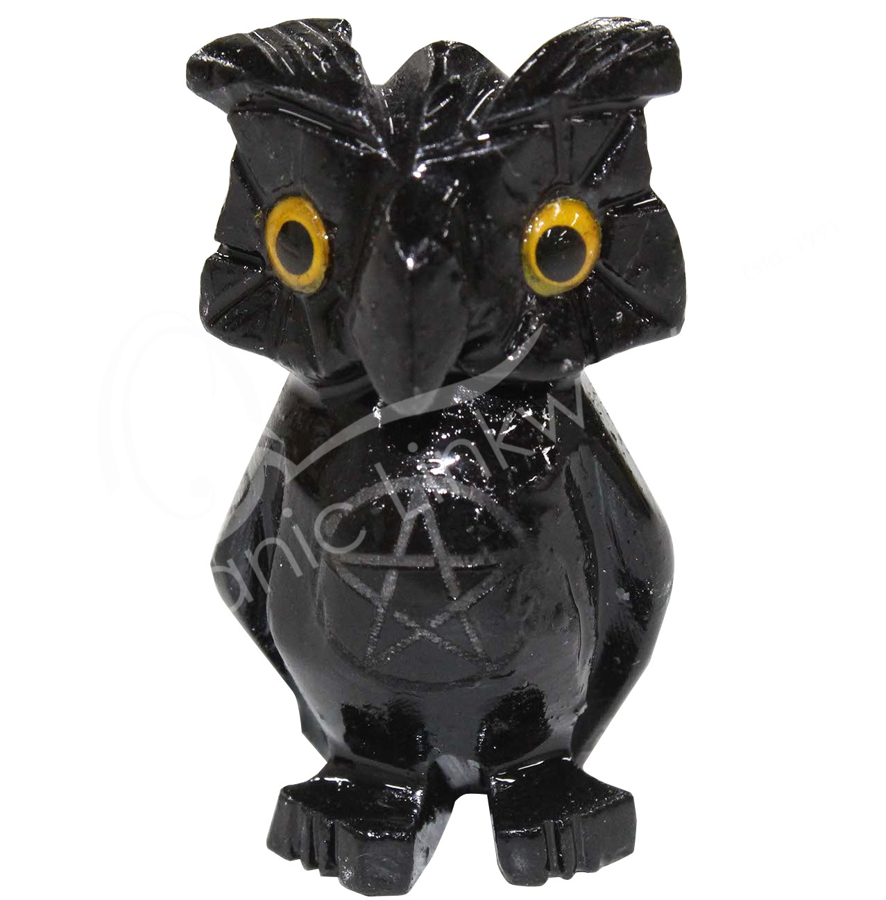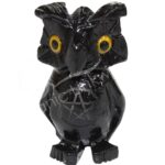(CLOSE OUT) CARVING – ONYX, BLACK OWL WITH ENGRAVED PENTACLE (PK 6) 1.5″