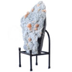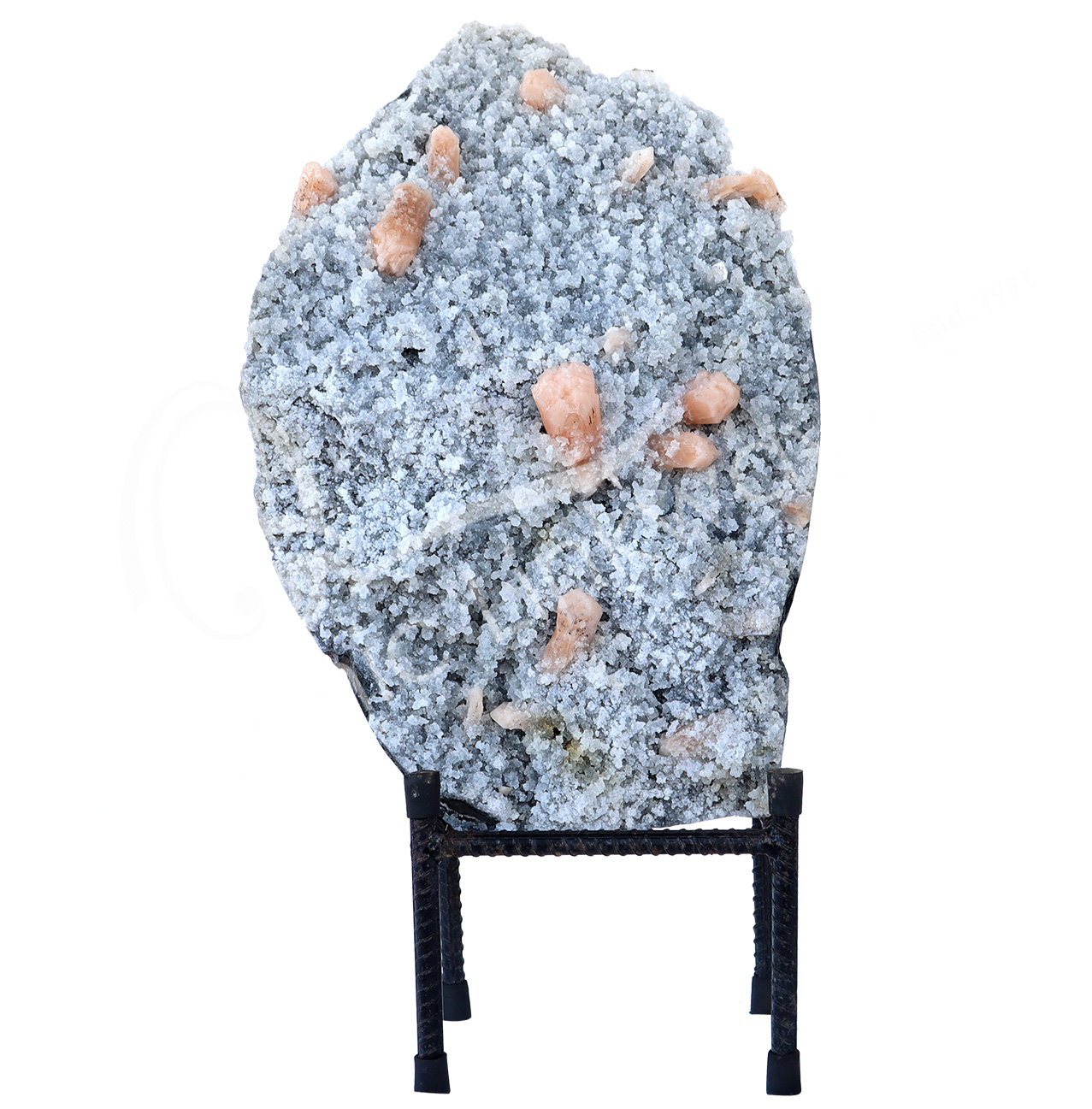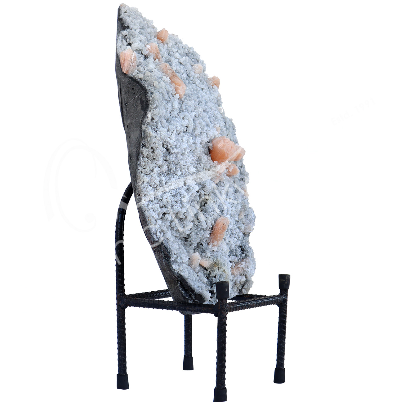 CLUSTER – CHALCEDONY, BLACK WITH APOPHYLLITE & PEACH STILBITE WITH STAND 17 X 11″