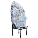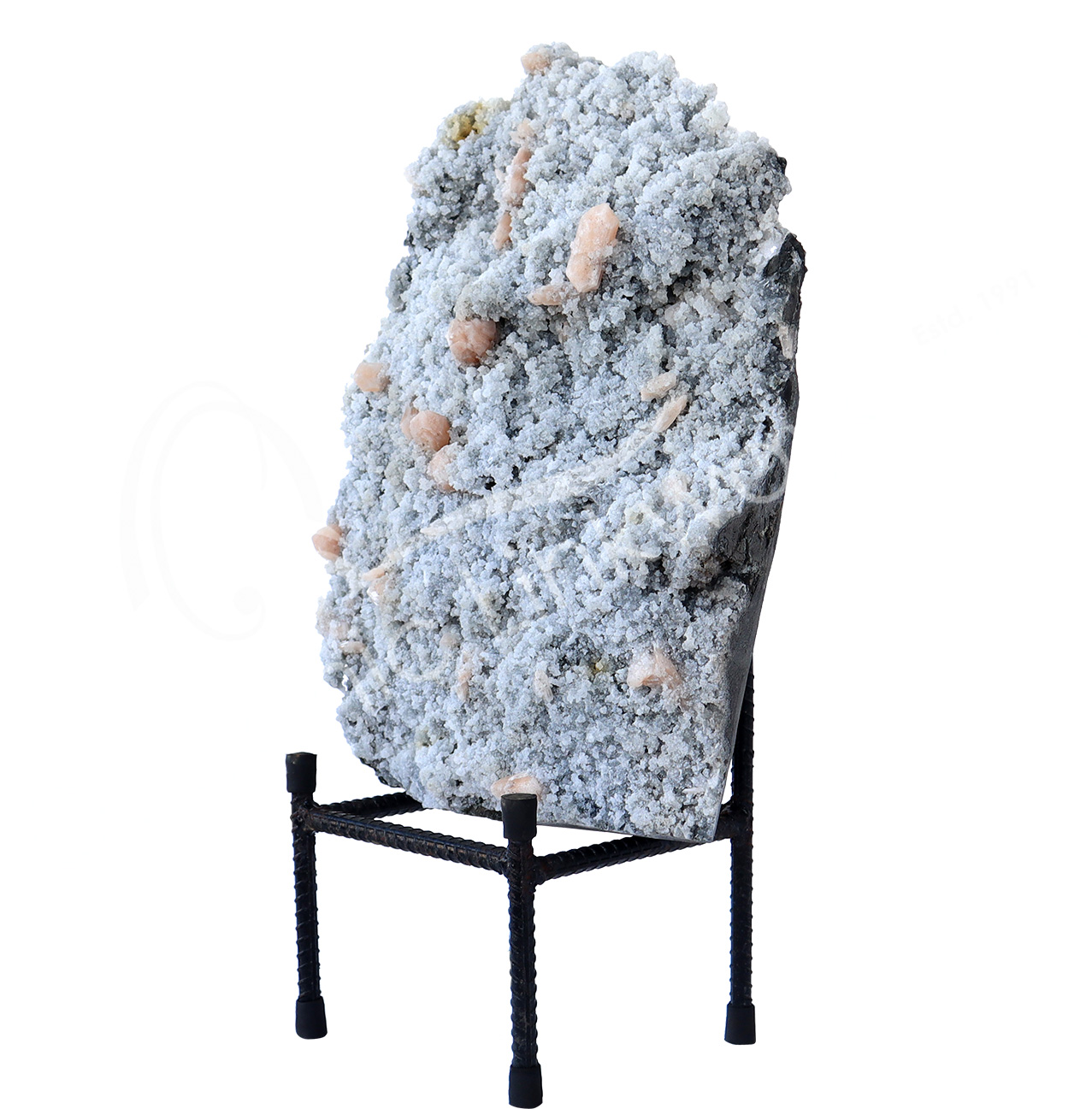 CLUSTER – CHALCEDONY, BLACK WITH APOPHYLLITE & PEACH STILBITE WITH STAND 17 X 13″