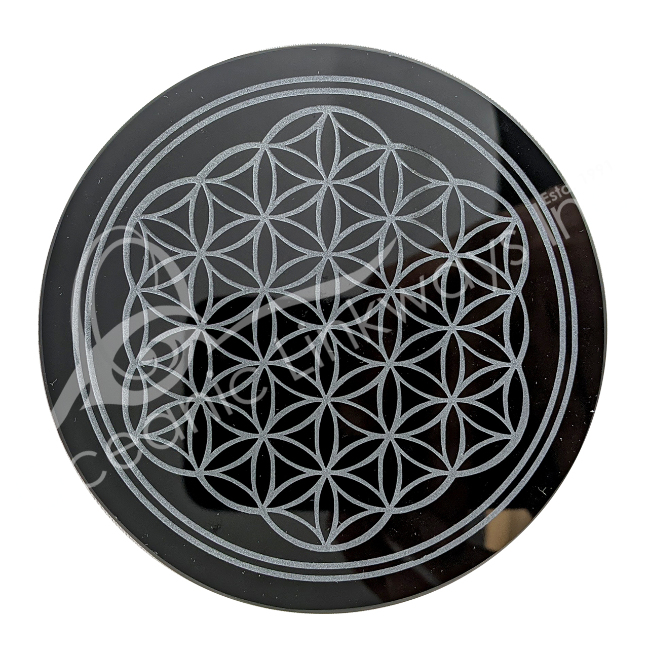 CRYSTAL GRID – OBSIDIAN, BLACK FLOWER OF LIFE 4″DIA