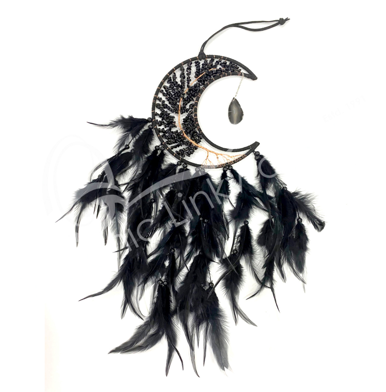 DREAMCATCHER – MOON TREE WITH CHIPS BLACK OBSIDIAN & BLACK FEATHERS 7.75″DIA. X 21.5″L