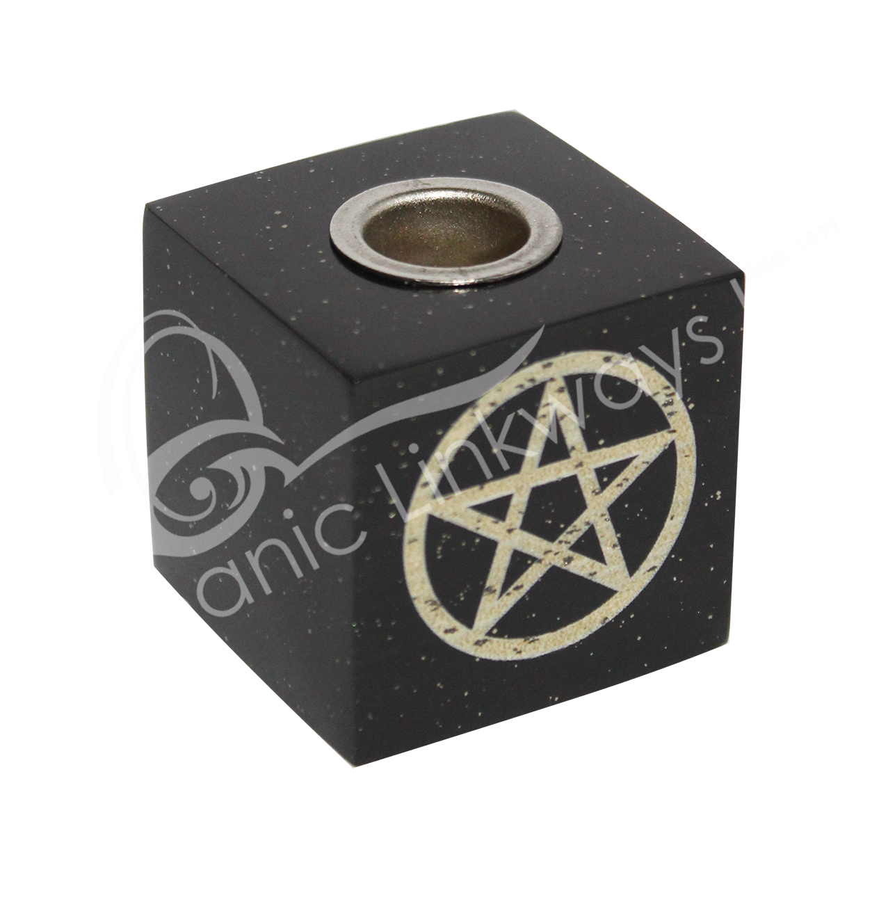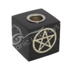 MINI CANDLE HOLDER – ONYX, BLACK WITH PYRITE CUBE WITH PENTACLE ENGRAVED 3″
