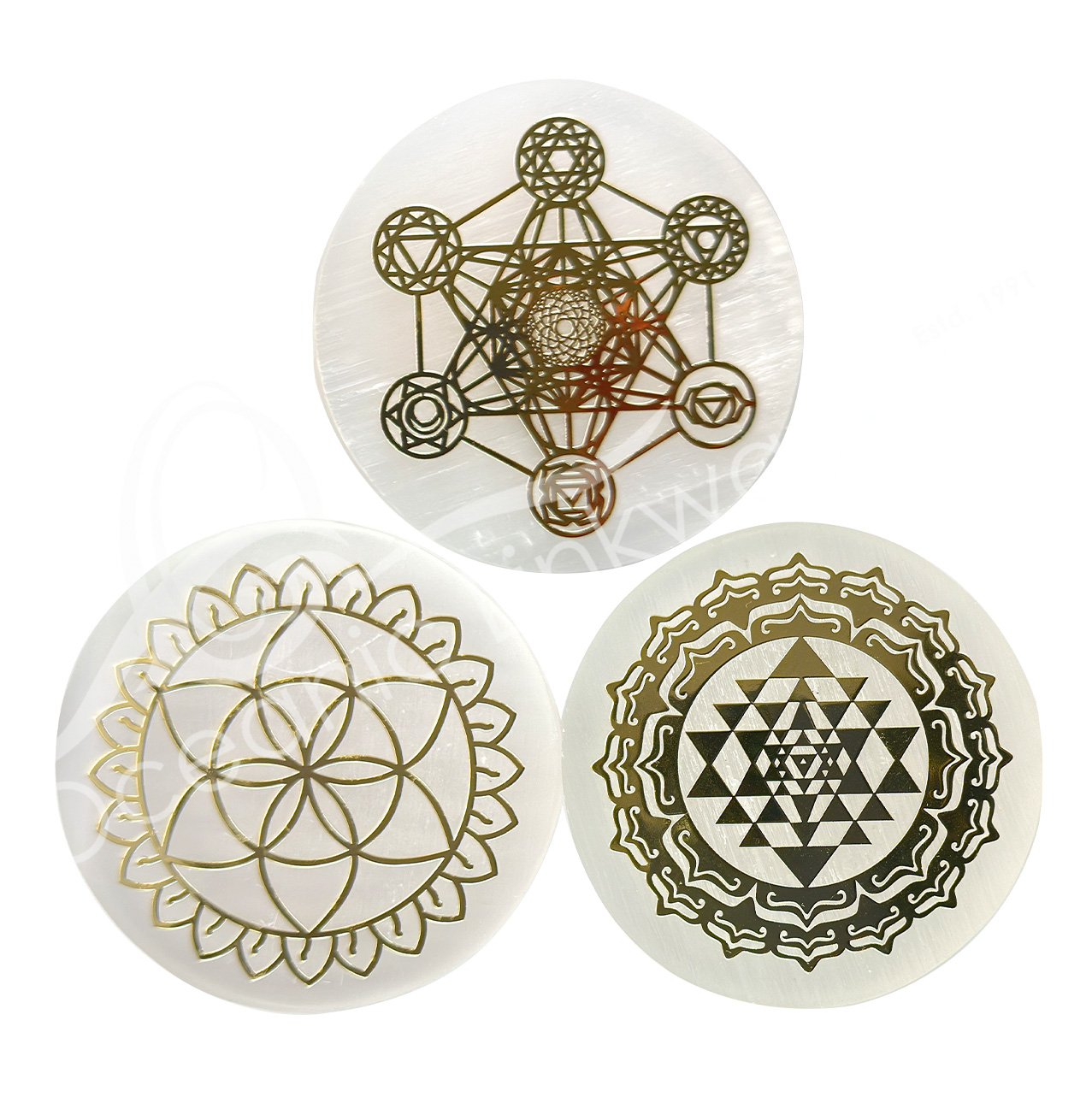 CHARGER PLAQUE – SELENITE WITH METAL GOLD DESIGN FLOWER OF LIFE (PK 3) 2.5″