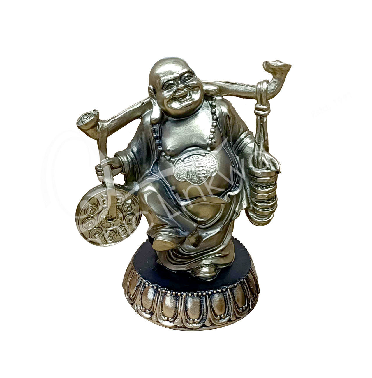 STATUE – HAPPY BUDDHA, GOLD CARRYING COINS 5.25″L X 6.30″H