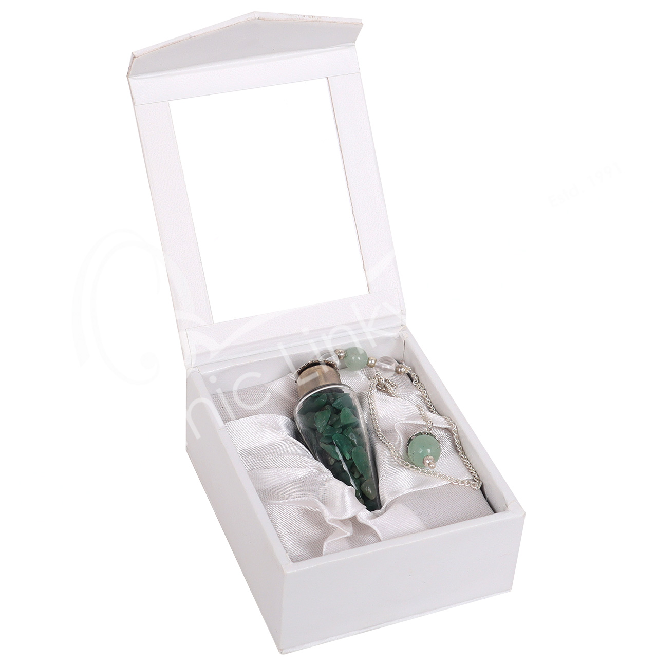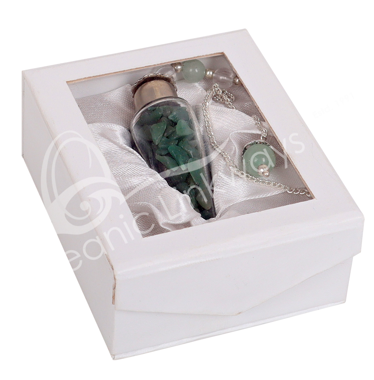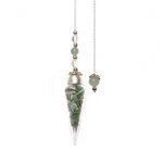 PENDULUM – GLASS TEARDROP AVENTURINE, GREEN CHIPS STONES BEADED CHAIN 11″L