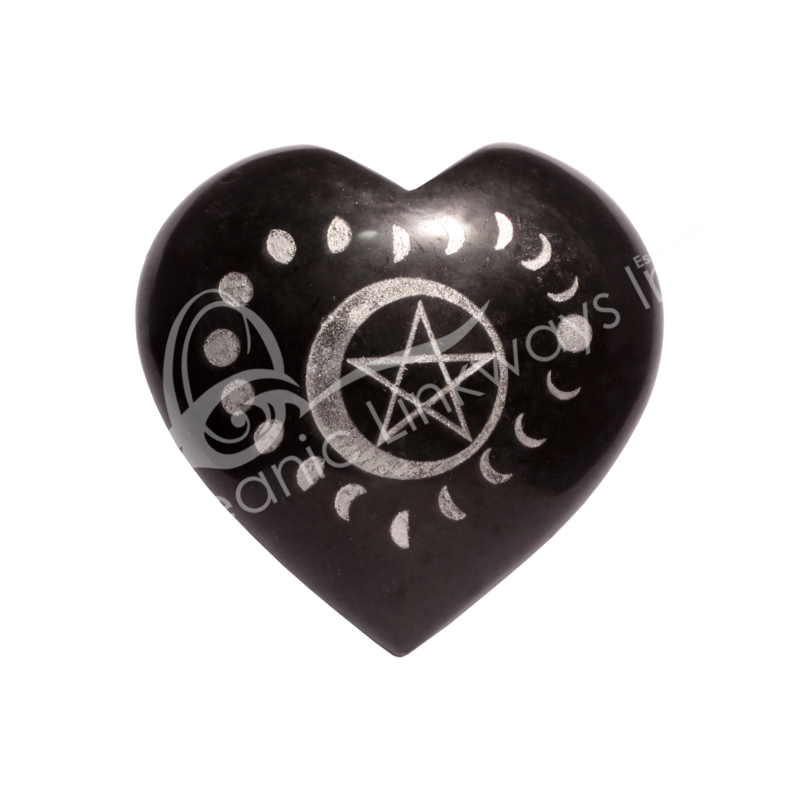 (CLOSE OUT) HEART – TOURMALINE, BLACK PENTACLE & MOON PHASE SILVER 3″