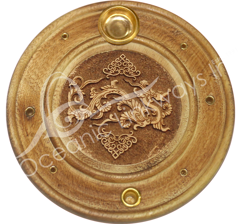 INCENSE HOLDER – WOOD ROUND LASER ENGRAVED DRAGON (PK 3) 4″DIA