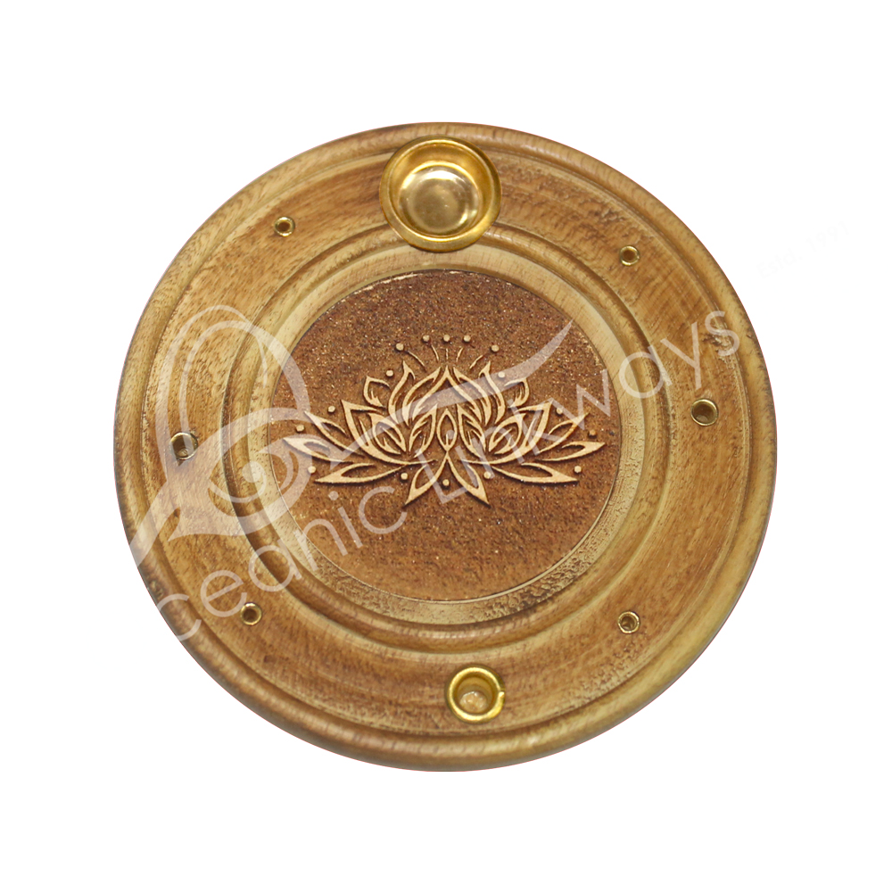 INCENSE HOLDER – WOOD ROUND LASER ENGRAVED LOTUS (PK 3) 4″DIA