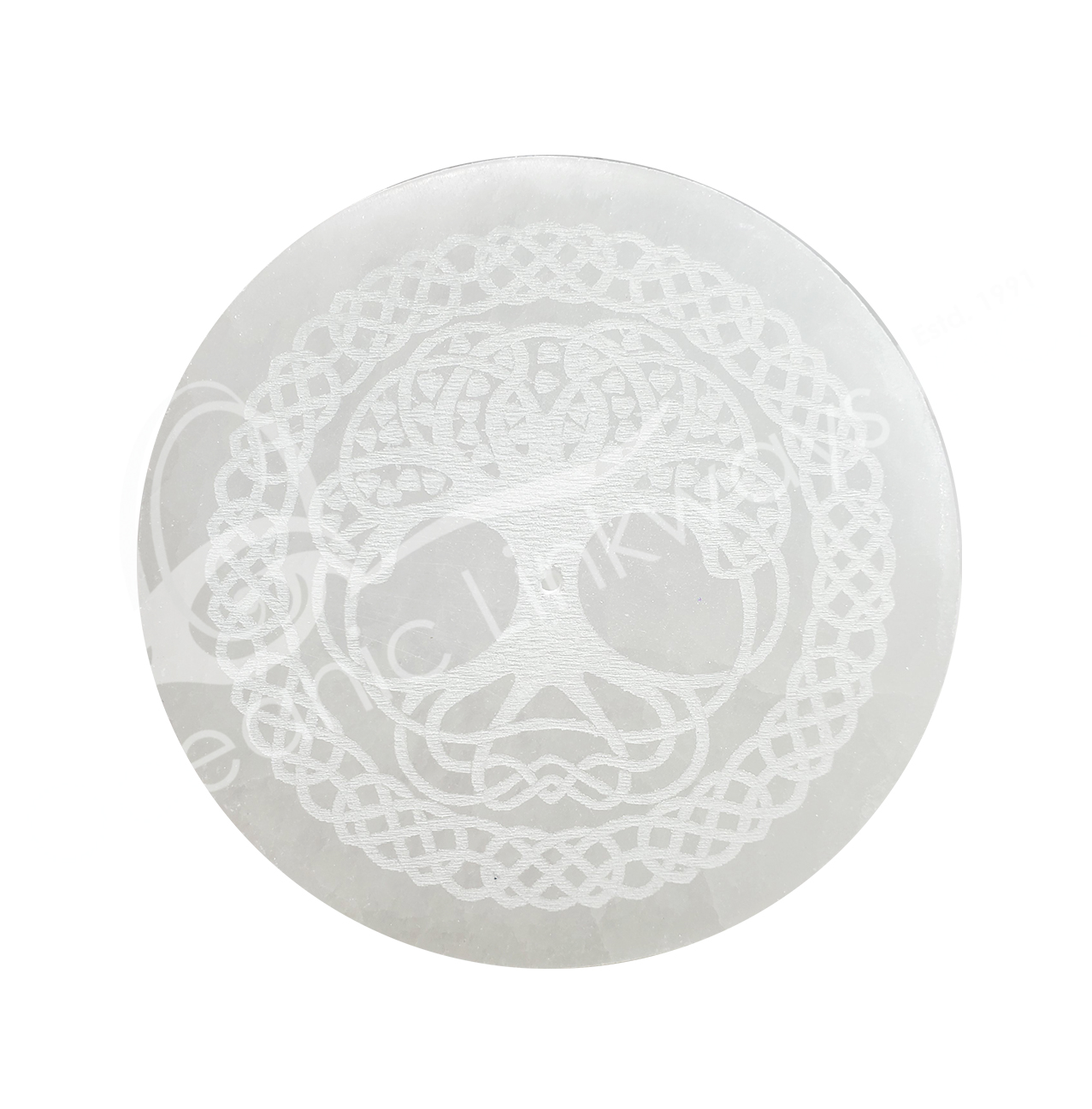 INCENSE HOLDER – SELENITE TREE OF LIFE ENGRAVED 4″DIA