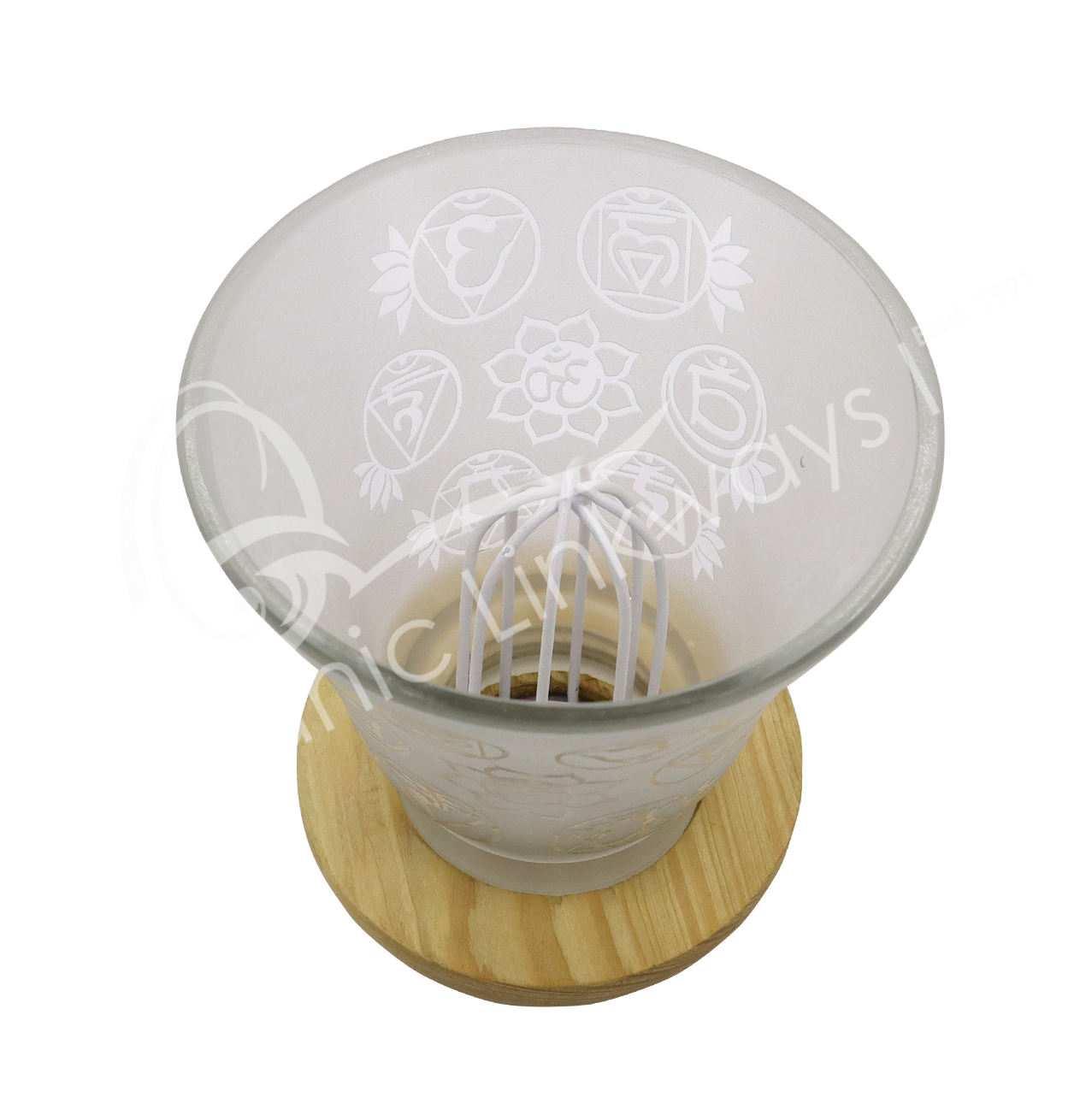 LAMP – SELENITE NATURAL CHUNKS IN FROSTED GLASS WITH CHAKRAS NO CORD 4.75-5″H