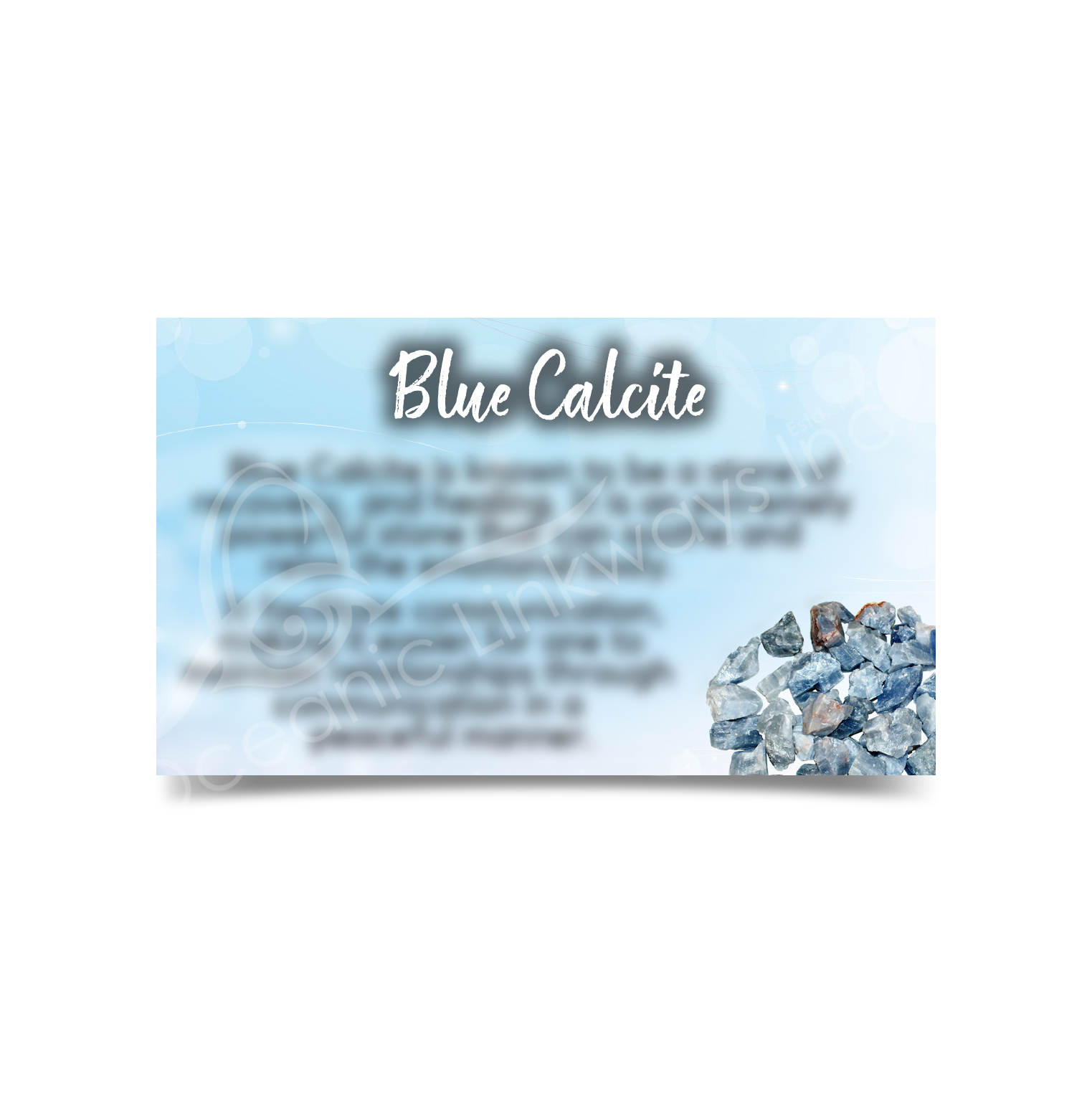 Deprecated: Function Yoast\WP\SEO\Helpers\Request_Helper::is_rest_request is deprecated since version Yoast SEO 23.6! Use wp_is_serving_rest_request instead. in /var/www/html/wp-includes/functions.php on line 6121 (CLOSE OUT) MARKETING CARD - CALCITE, BLUE (PK 50) 2X3" | Oceanic Linkways Inc - Wholesaler of Gemstones, Minerals, Jewelry and More!