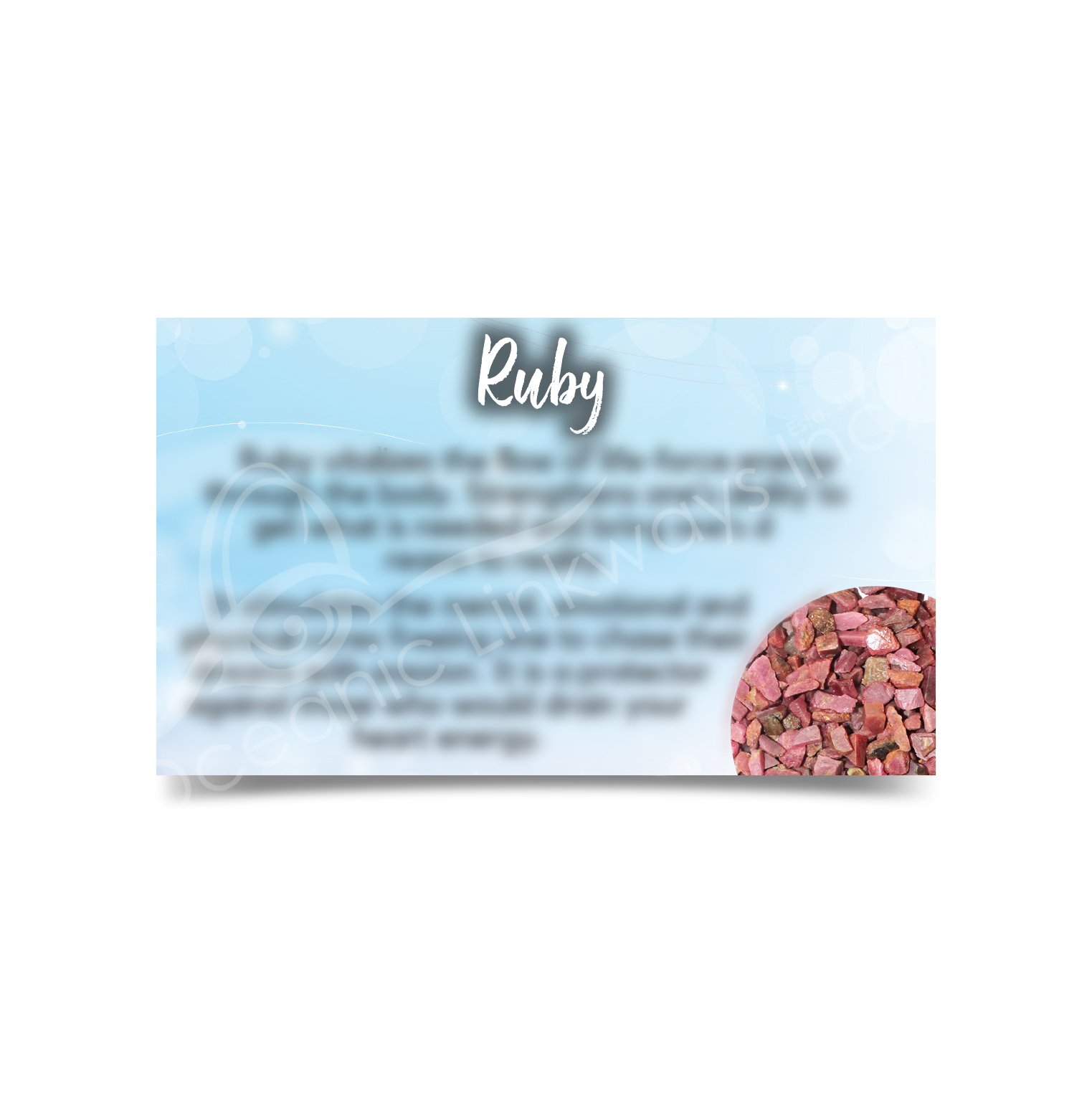 Deprecated: Function Yoast\WP\SEO\Helpers\Request_Helper::is_rest_request is deprecated since version Yoast SEO 23.6! Use wp_is_serving_rest_request instead. in /var/www/html/wp-includes/functions.php on line 6121 (CLOSE OUT) MARKETING CARD - RUBY (PK 50) 2 X 3" | Oceanic Linkways Inc - Wholesaler of Gemstones, Minerals, Jewelry and More!