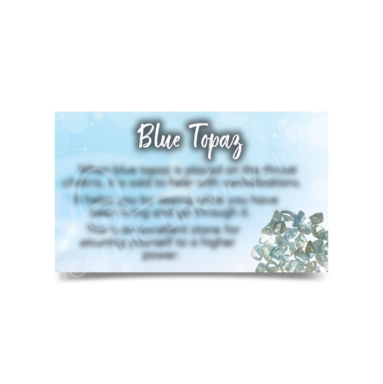 Deprecated: Function Yoast\WP\SEO\Helpers\Request_Helper::is_rest_request is deprecated since version Yoast SEO 23.6! Use wp_is_serving_rest_request instead. in /var/www/html/wp-includes/functions.php on line 6121 (CLOSE OUT) MARKETING CARD - TOPAZ, BLUE (PK 50) 2X3" | Oceanic Linkways Inc - Wholesaler of Gemstones, Minerals, Jewelry and More!