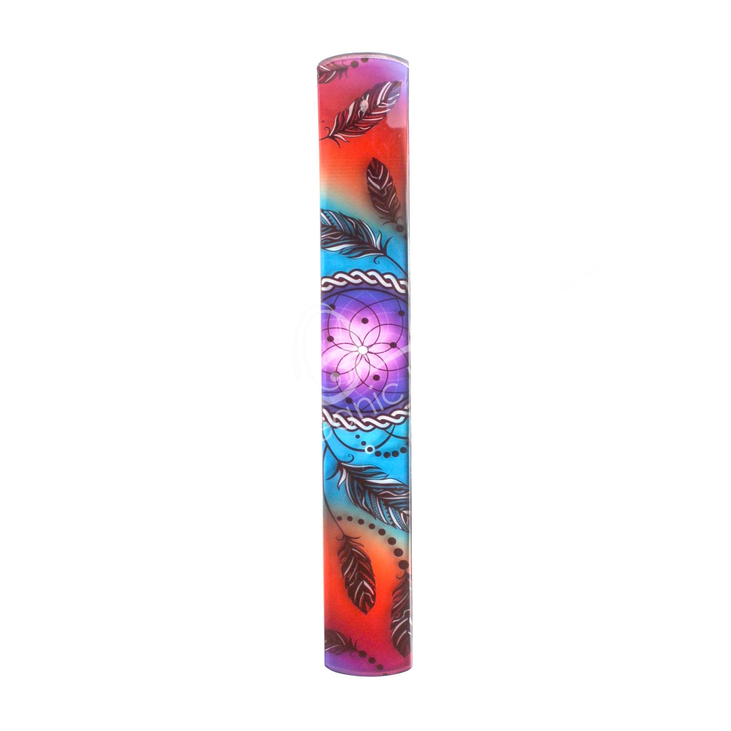 INCENSE HOLDER – GLASS PRINTED DREAM FEATHERS 10 X 1.5″