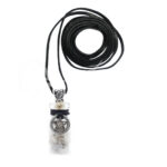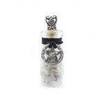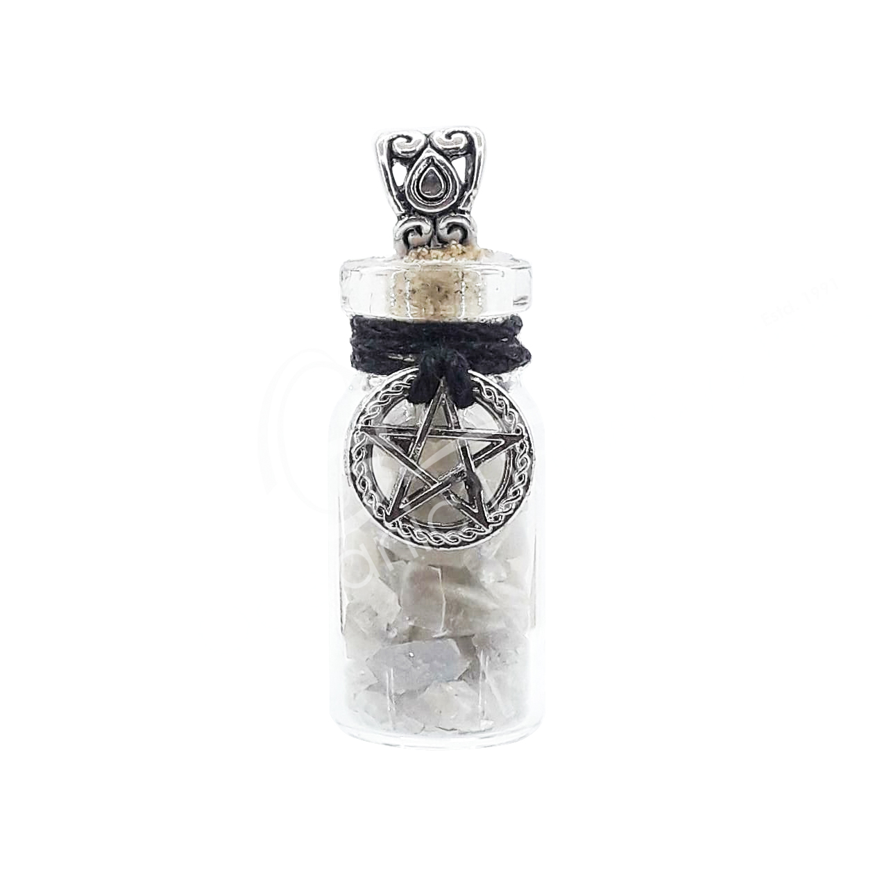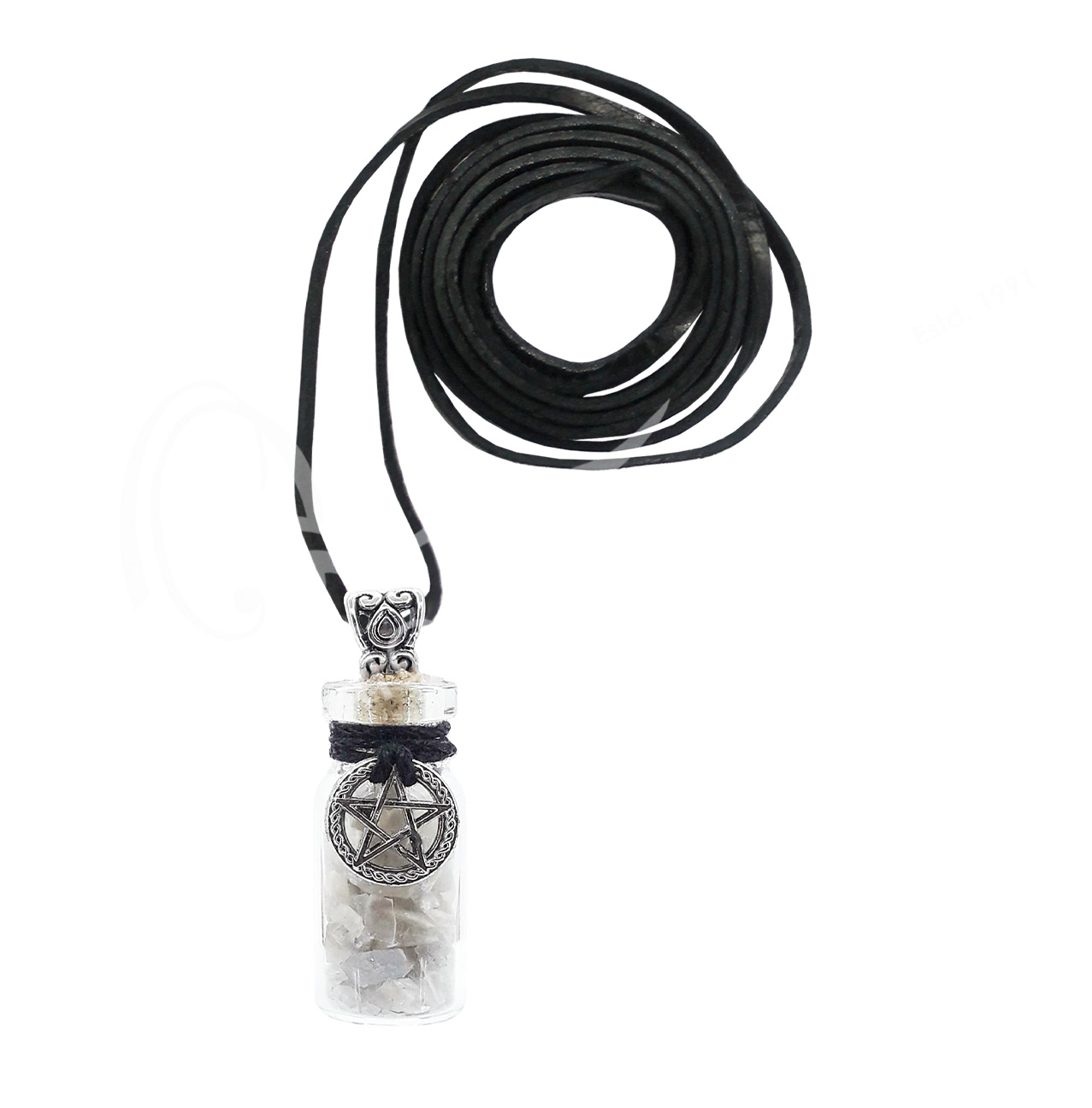 NECKLACE – CHIPS STONES IN BOTTLE MOONSTONE, BLACK WITH PENTACLE 1.5″H