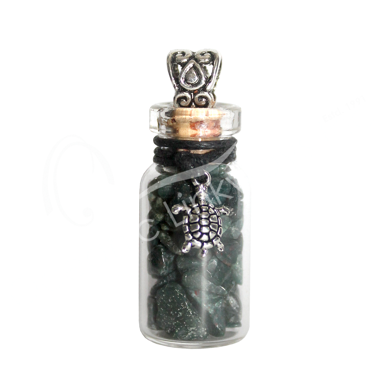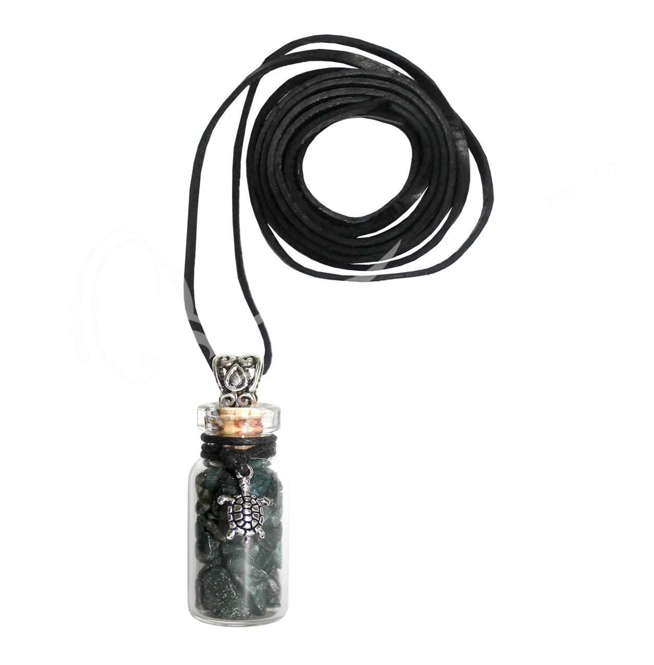 NECKLACE – CHIPS STONES IN BOTTLE AGATE, GREEN MOSS WITH TURTLE 1.5″H