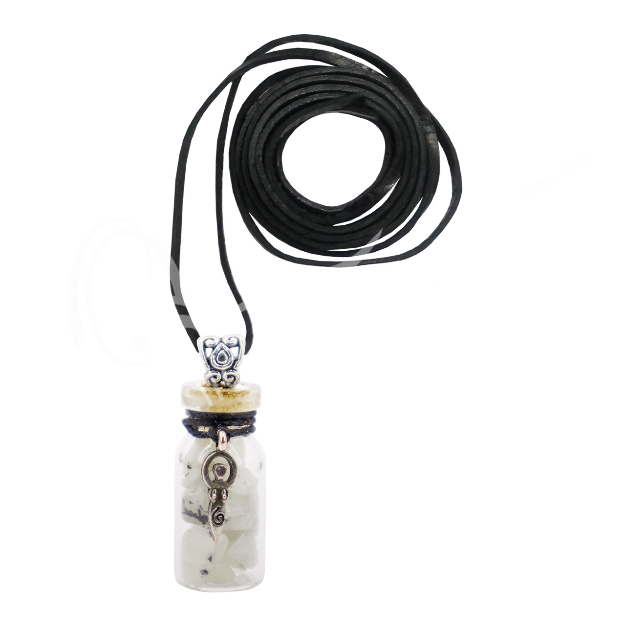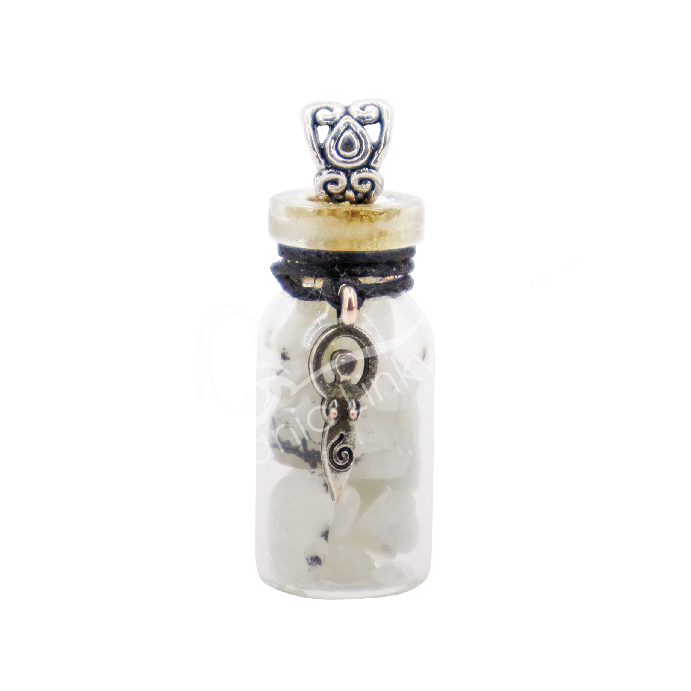 NECKLACE – CHIPS STONES IN BOTTLE MOONSTONE, RAINBOW WITH GODDESS 1.5″H