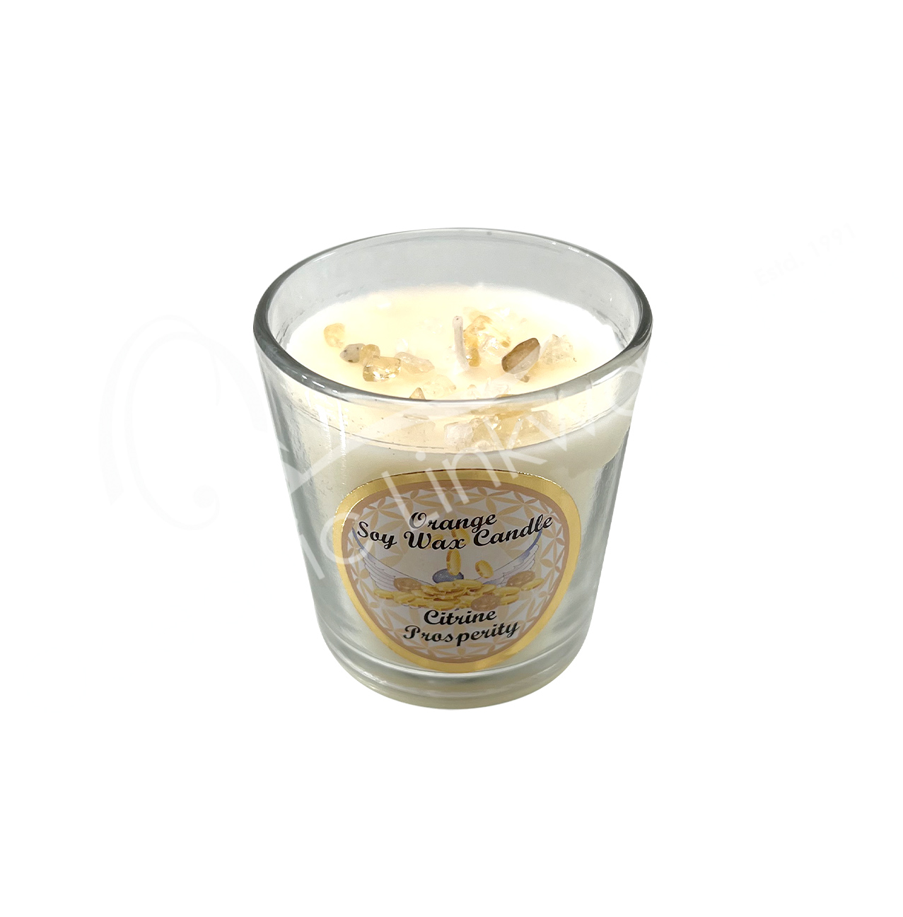 CANDLE VOTIVE – SOY WAX ORANGE WITH CITRINE/PROSPERITY (PK 6) 2.25-2.5″H X 2.25″DIA.