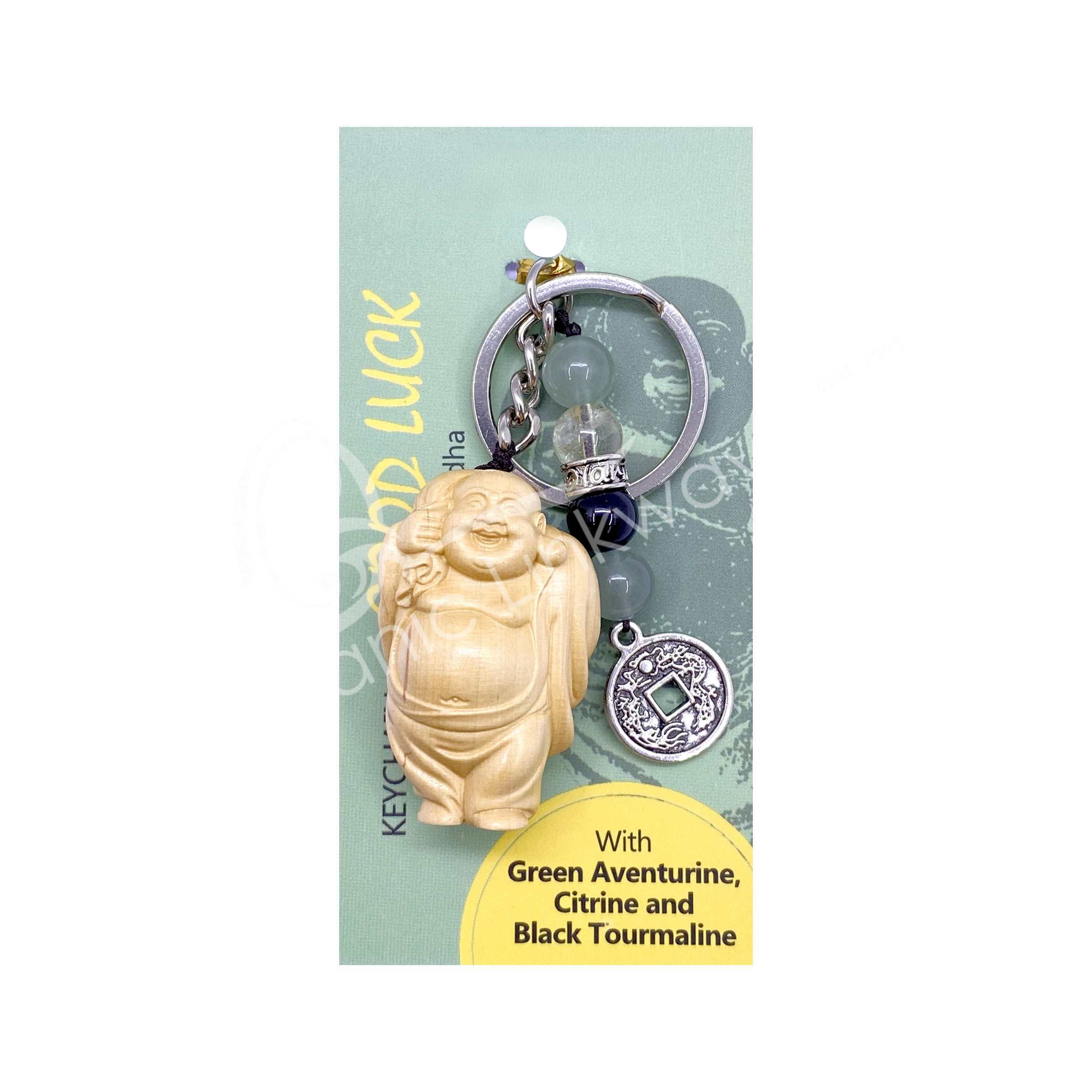 KEYCHAIN – WOOD HAPPY BUDDHA FOR GOOD LUCK 3.5-3.75″L
