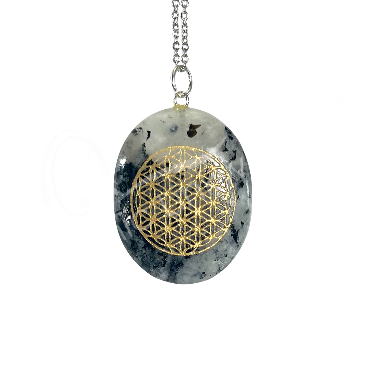 PENDANT – WORRY STONE MOONSTONE, RAINBOW FLOWER OF LIFE 1.5-1.75″