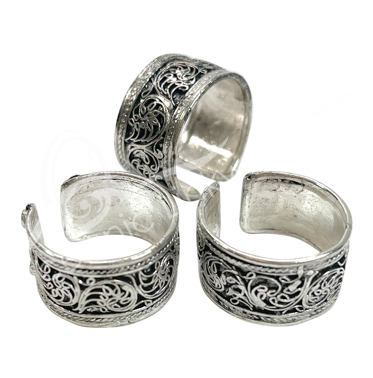 RING – WHITE METAL WITH FILIGREE ADJUSTABLE (PK 3) 9.5 MM W