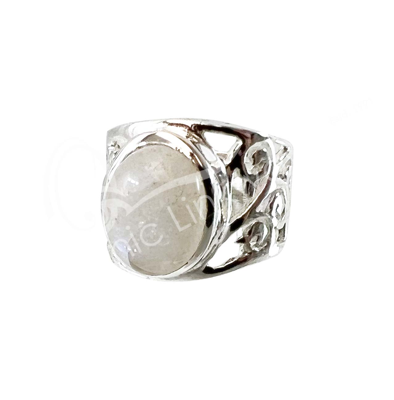 STERLING SILVER – RING BIG OVAL CABOCHON RAINBOW MOONSTONE ADJUSTABLE 0.5″W