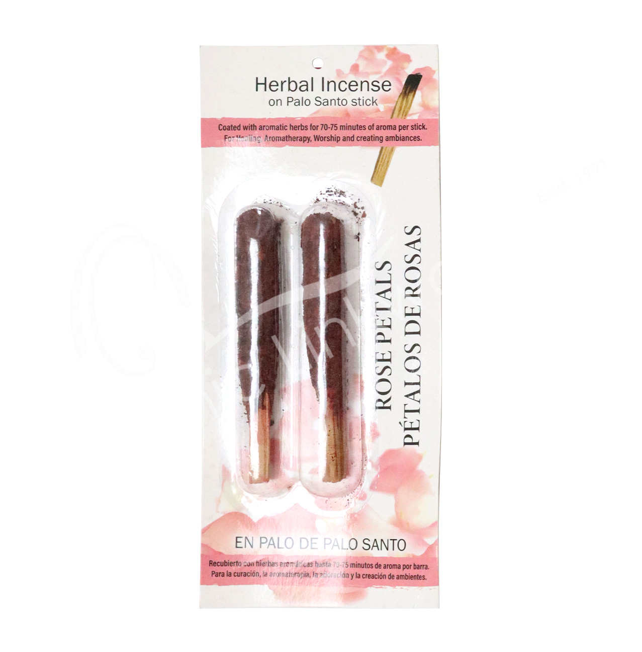 INCENSE – HERBAL RESIN ON PALO SANTO STICKS ROSE (PK 2) 4-4.25″