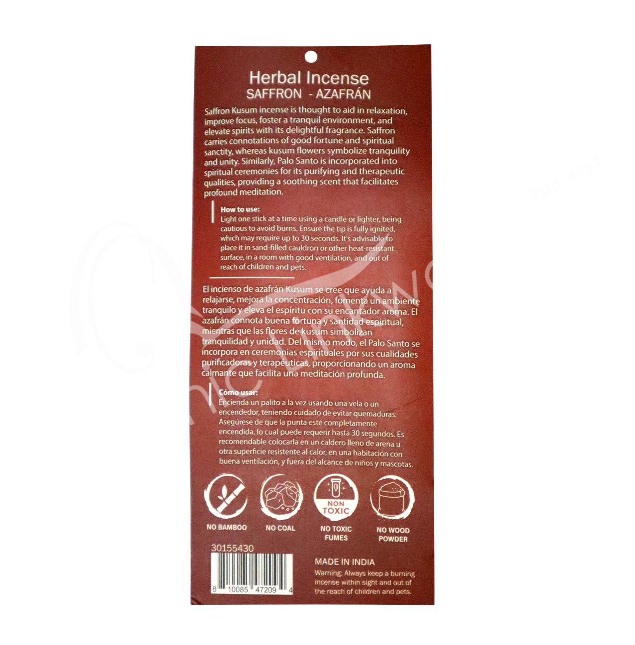 Deprecated: Function Yoast\WP\SEO\Helpers\Request_Helper::is_rest_request is deprecated since version Yoast SEO 23.6! Use wp_is_serving_rest_request instead. in /var/www/html/wp-includes/functions.php on line 6121 Saffron Herbal Resin on Palo Santo Stick | Oceanic Linkways in NJ
