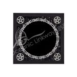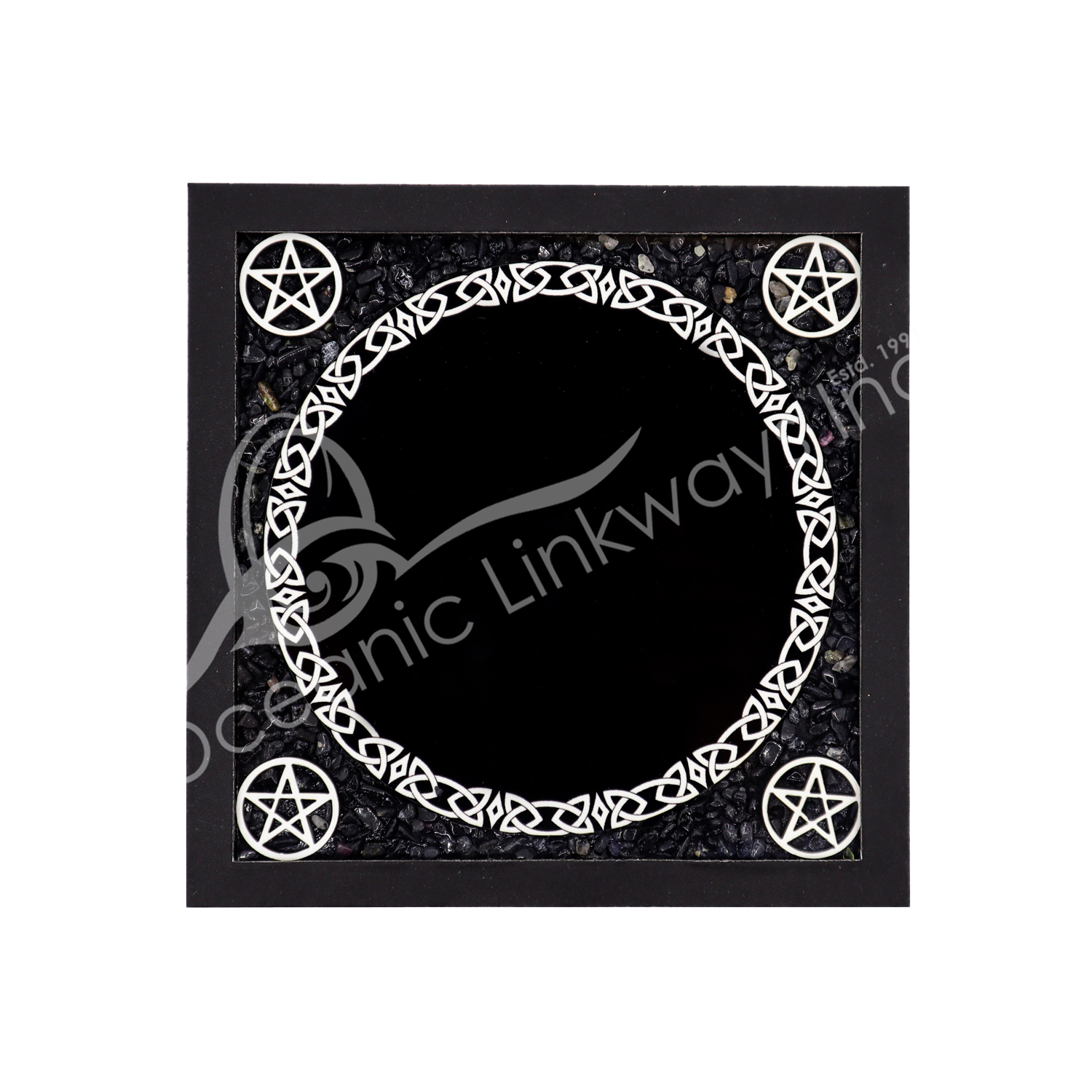 SCRYING MIRROR – TOURMALINE, BLACK CHIPS WITH BLACK LEATHER FRAME 6.75 X 6.75″