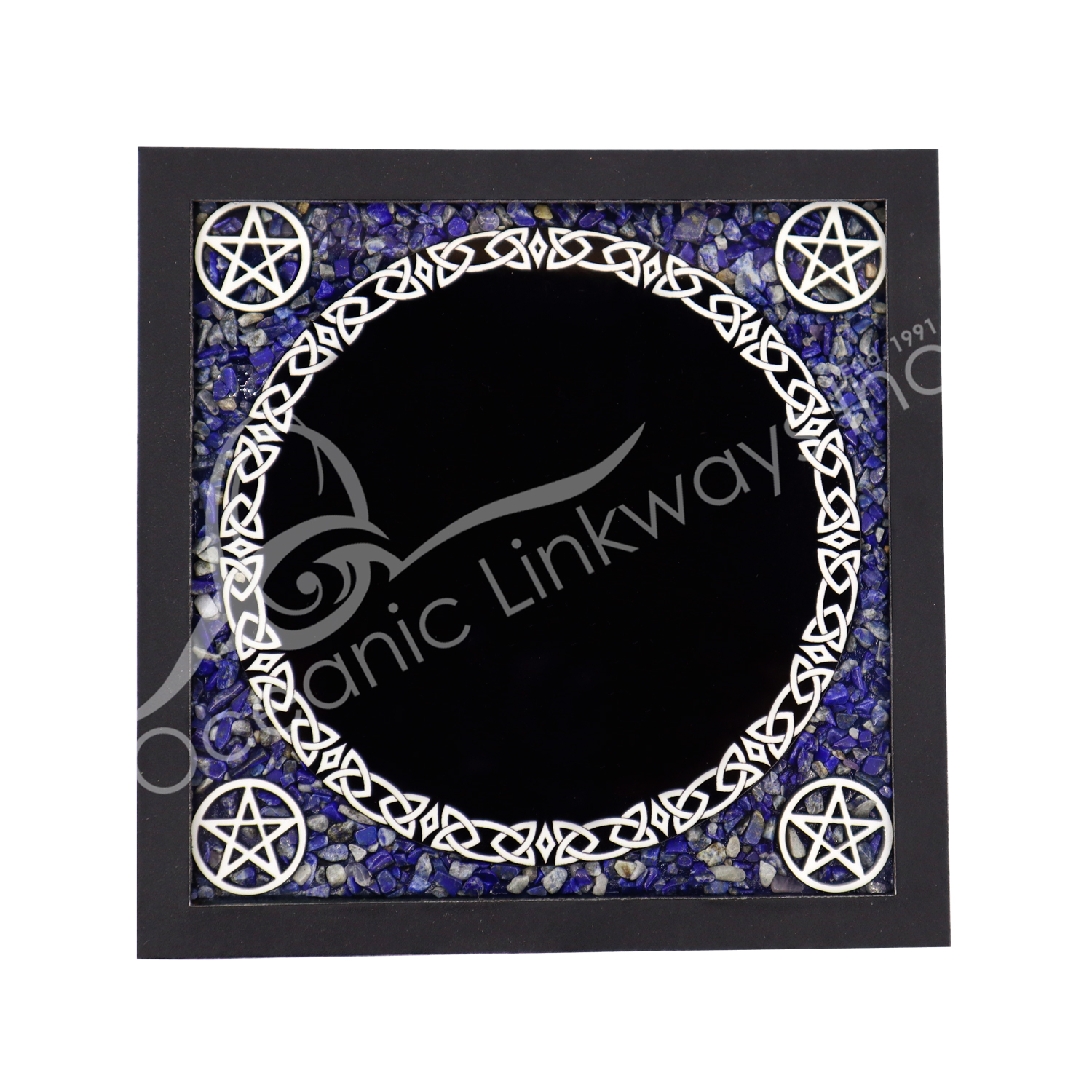 SCRYING MIRROR – SODALITE CHIPS WITH BLACK LEATHER FRAME 6.75 X 6.75″