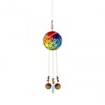 HANGING BELLS – BRASS CHAKRA W/RAINBOW GLASS BEADS ON BLUE CORD 28″
