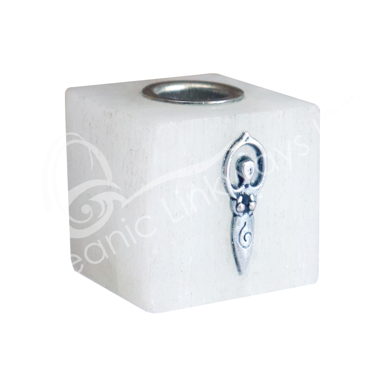 MINI CANDLE HOLDER – SELENITE CUBE WITH GODDESS CHARM (PK 3) 1.25″