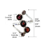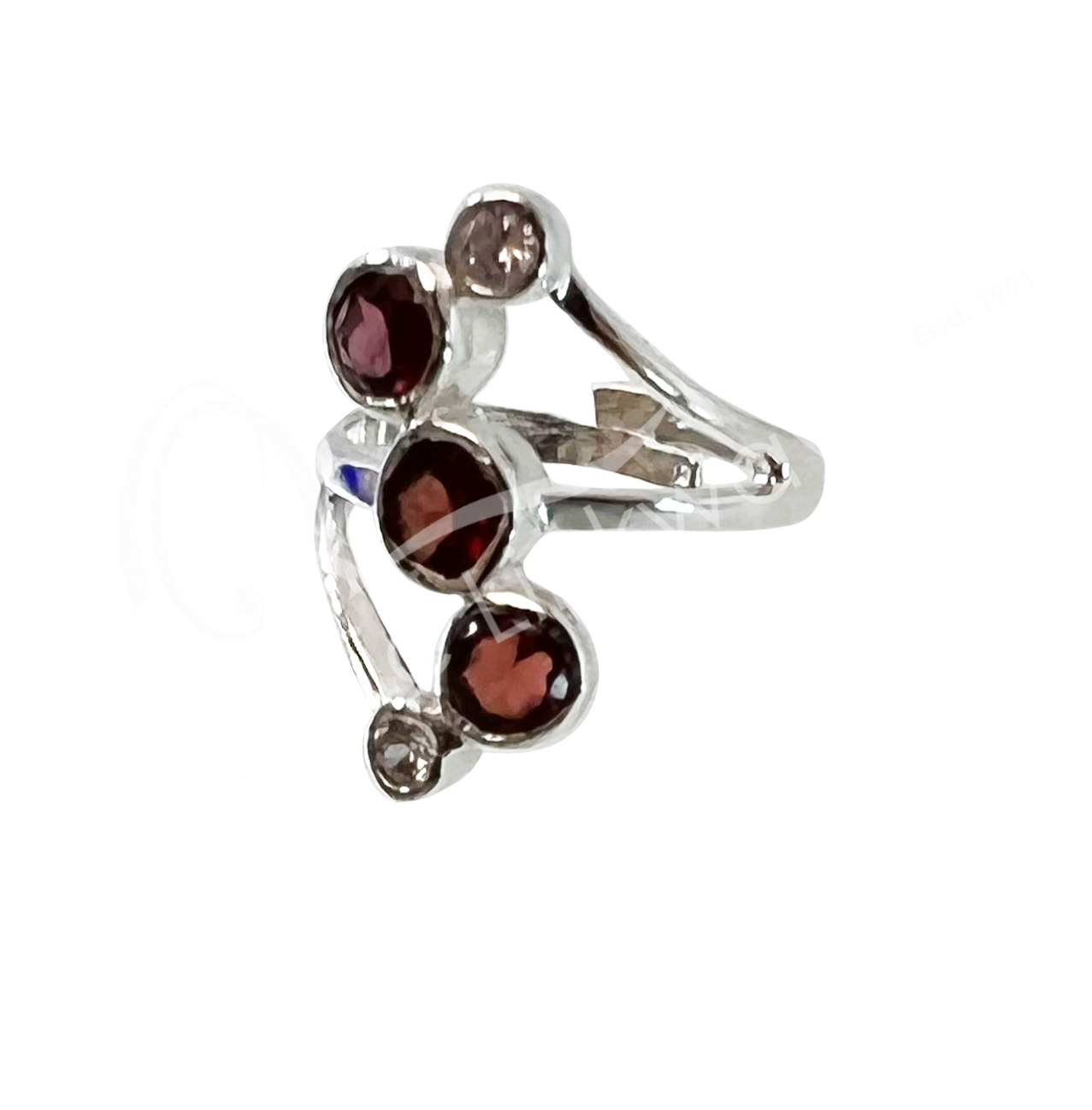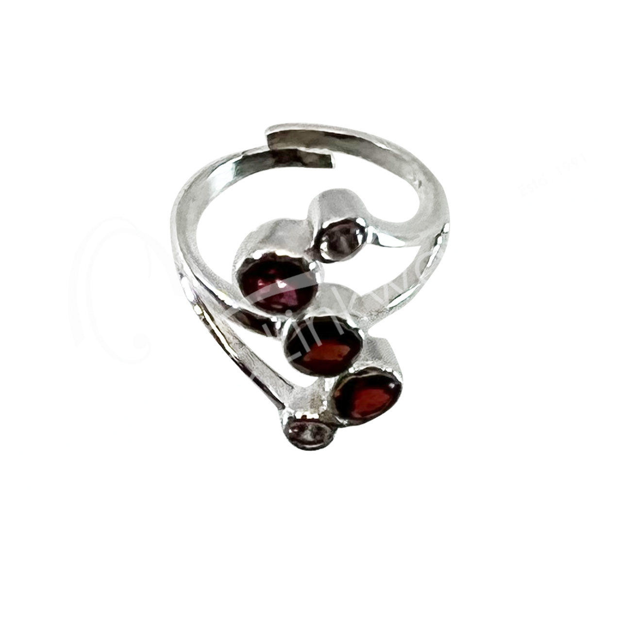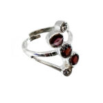 STERLING SILVER – RING, ADJUSTABLE 3 FACETED GARNETS & 2 ZIRCONS 0.75″W