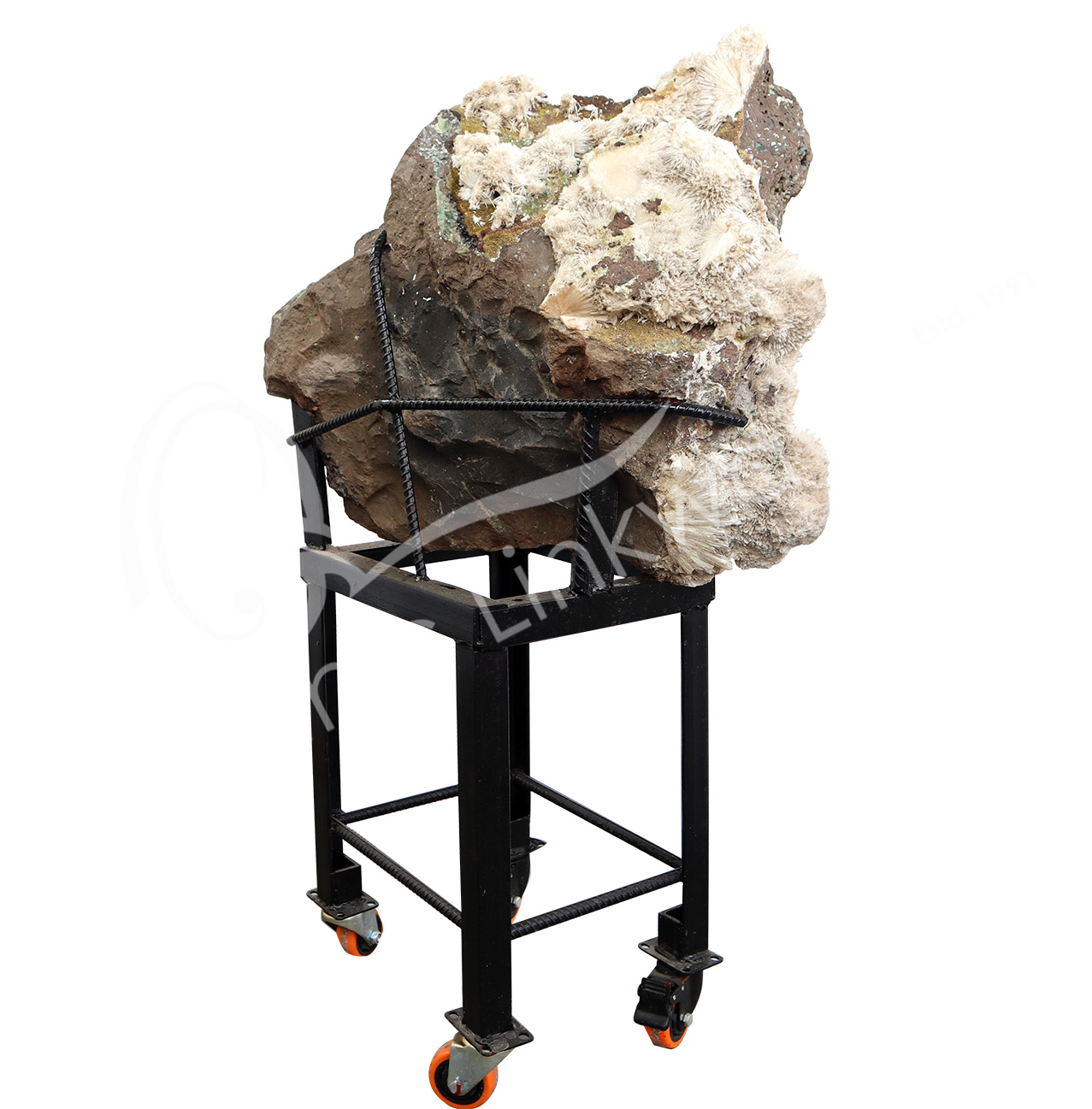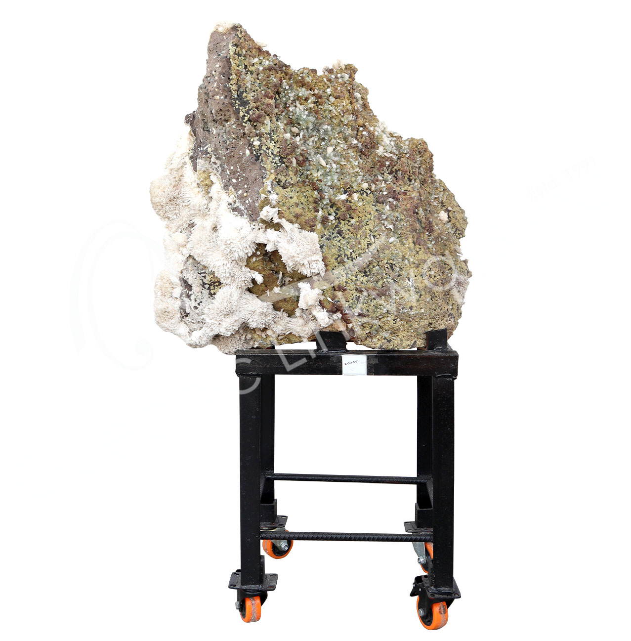SPECIMEN – APOPHYLLITE & STILBITE ON METAL STAND WITH WHEELS 46 X 27 X 13″