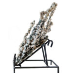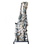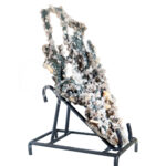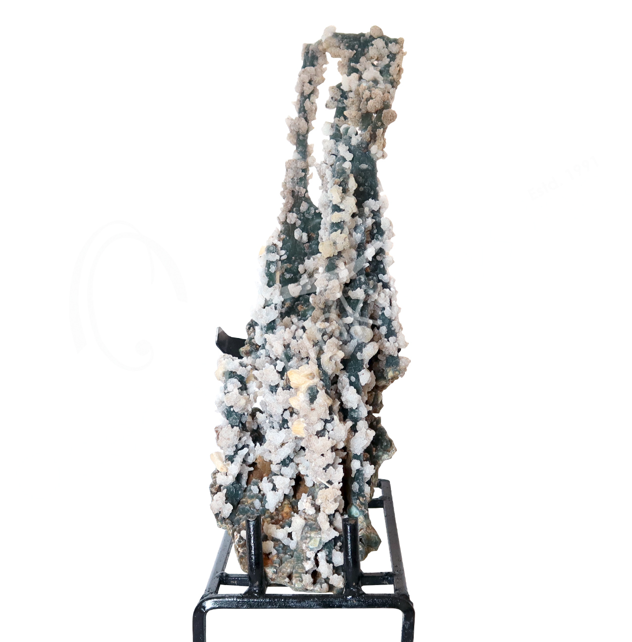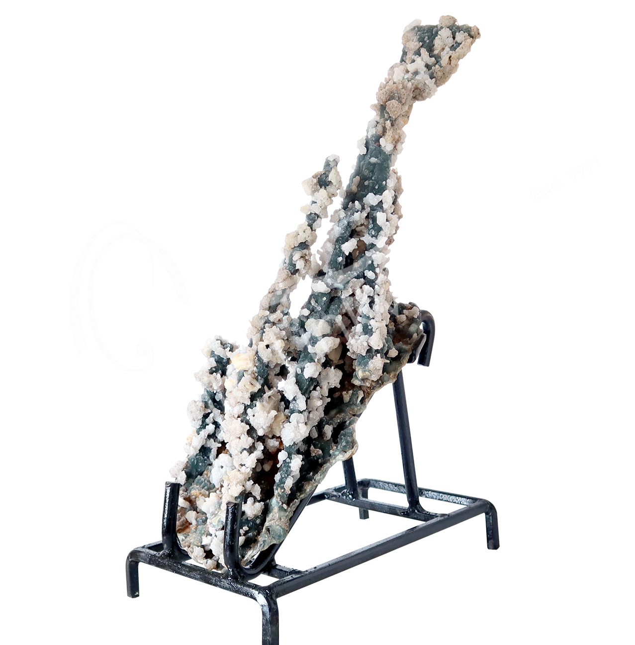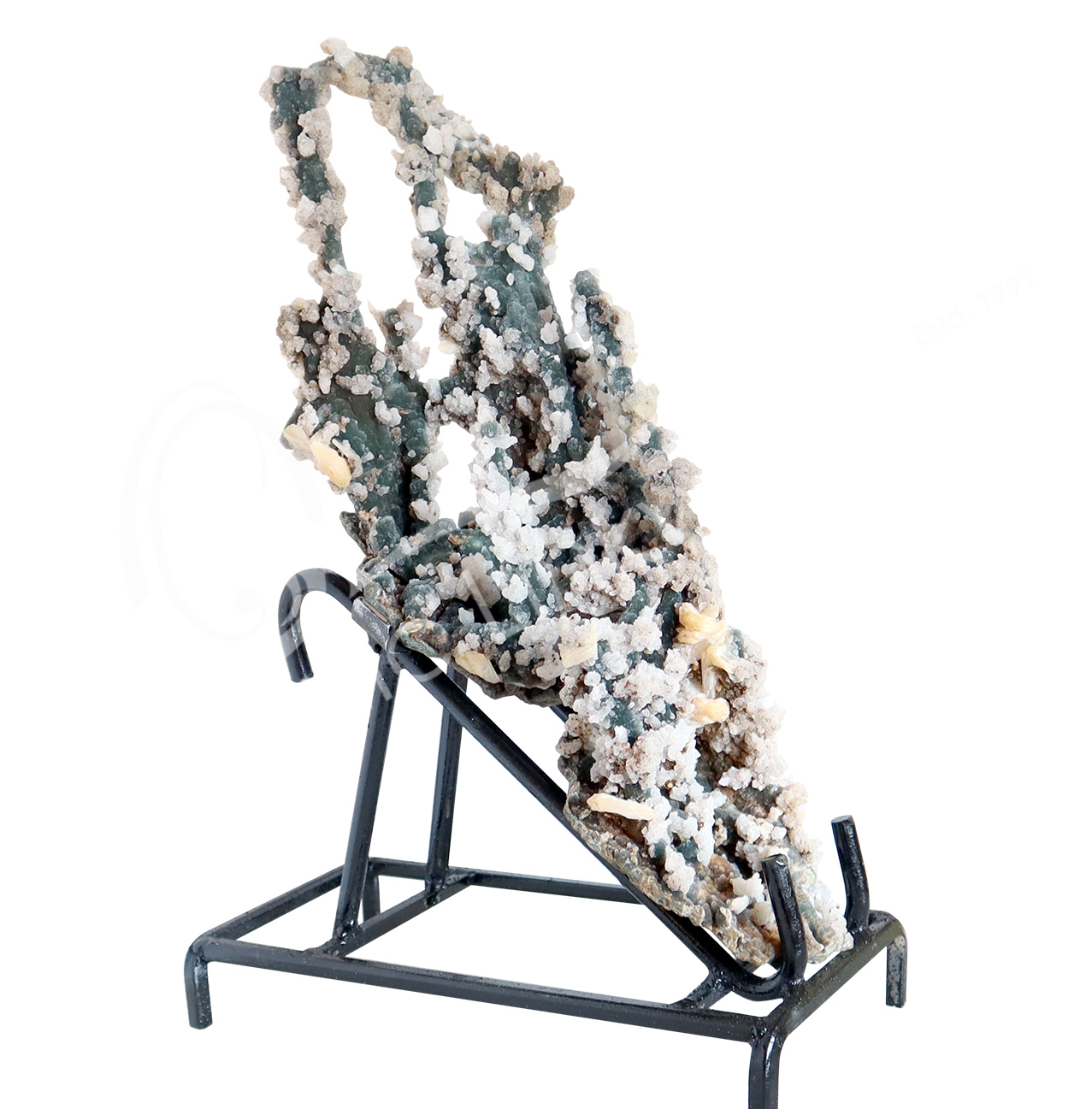 SPECIMEN – CHALCEDONY, CORAL & QUARTZ ON METAL STAND 11 X 6.5 X 13″