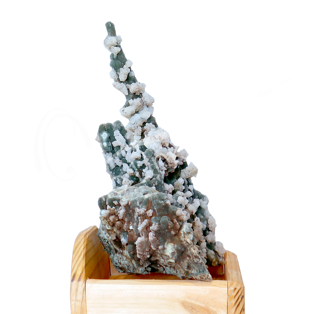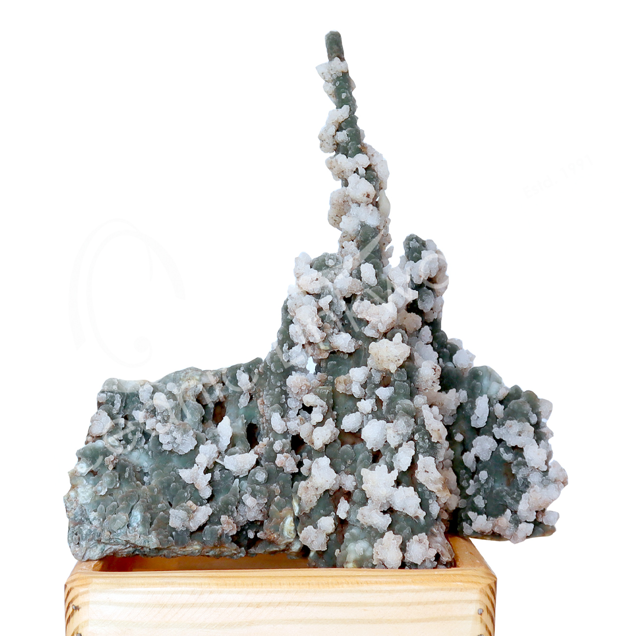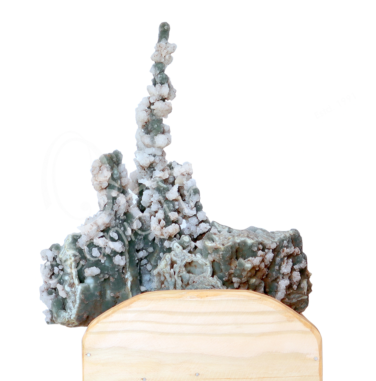 SPECIMEN – CHALCEDONY, CORAL & QUARTZ ON WOOD STAND 14 X 11 X 7″