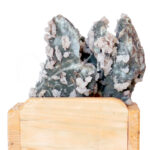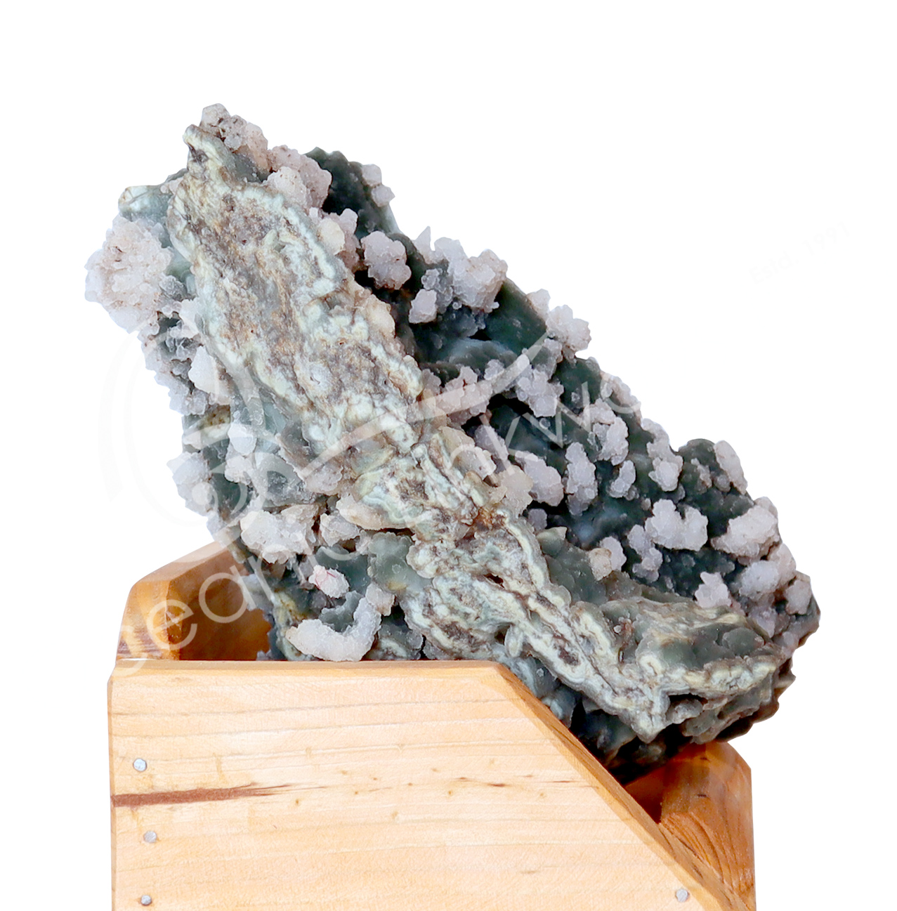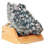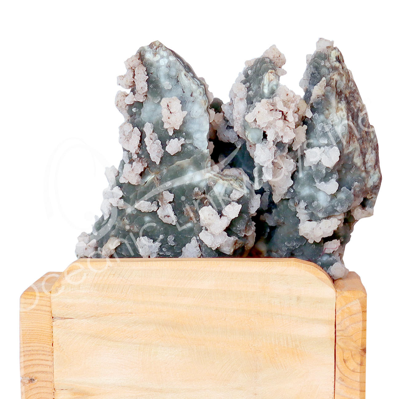 SPECIMEN – CHALCEDONY, CORAL & QUARTZ ON WOOD STAND 8.5 X 7.5 X 6″