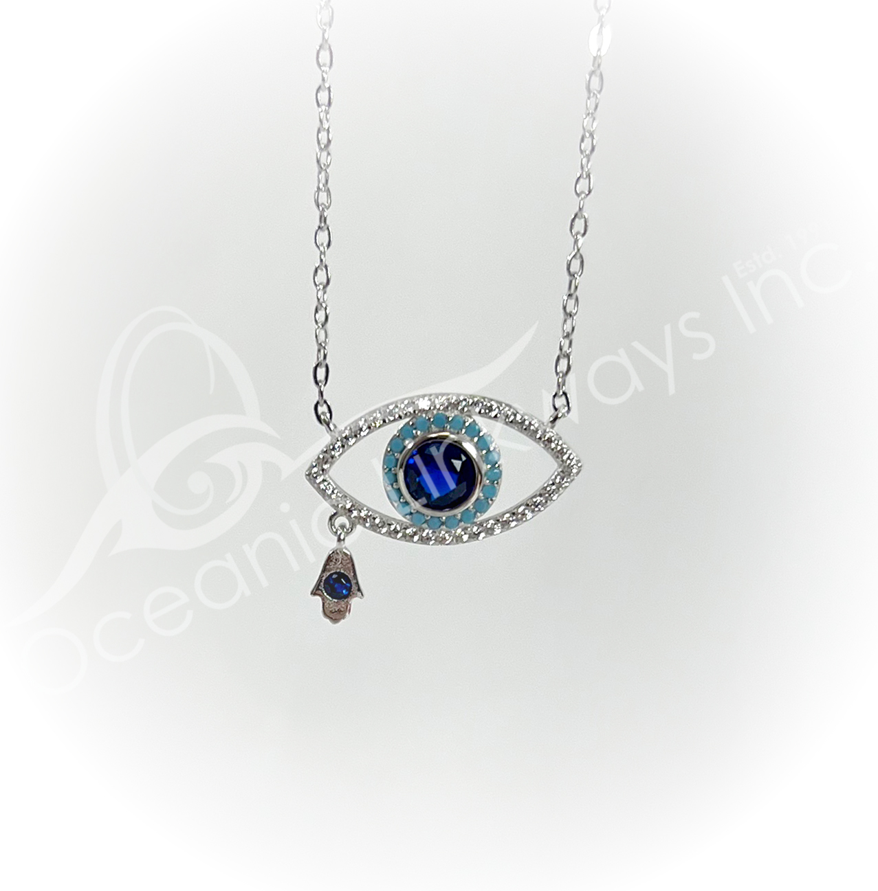 STERLING SILVER – NECKLACE EVIL EYE WITH HAND OF FATIMA 18″L